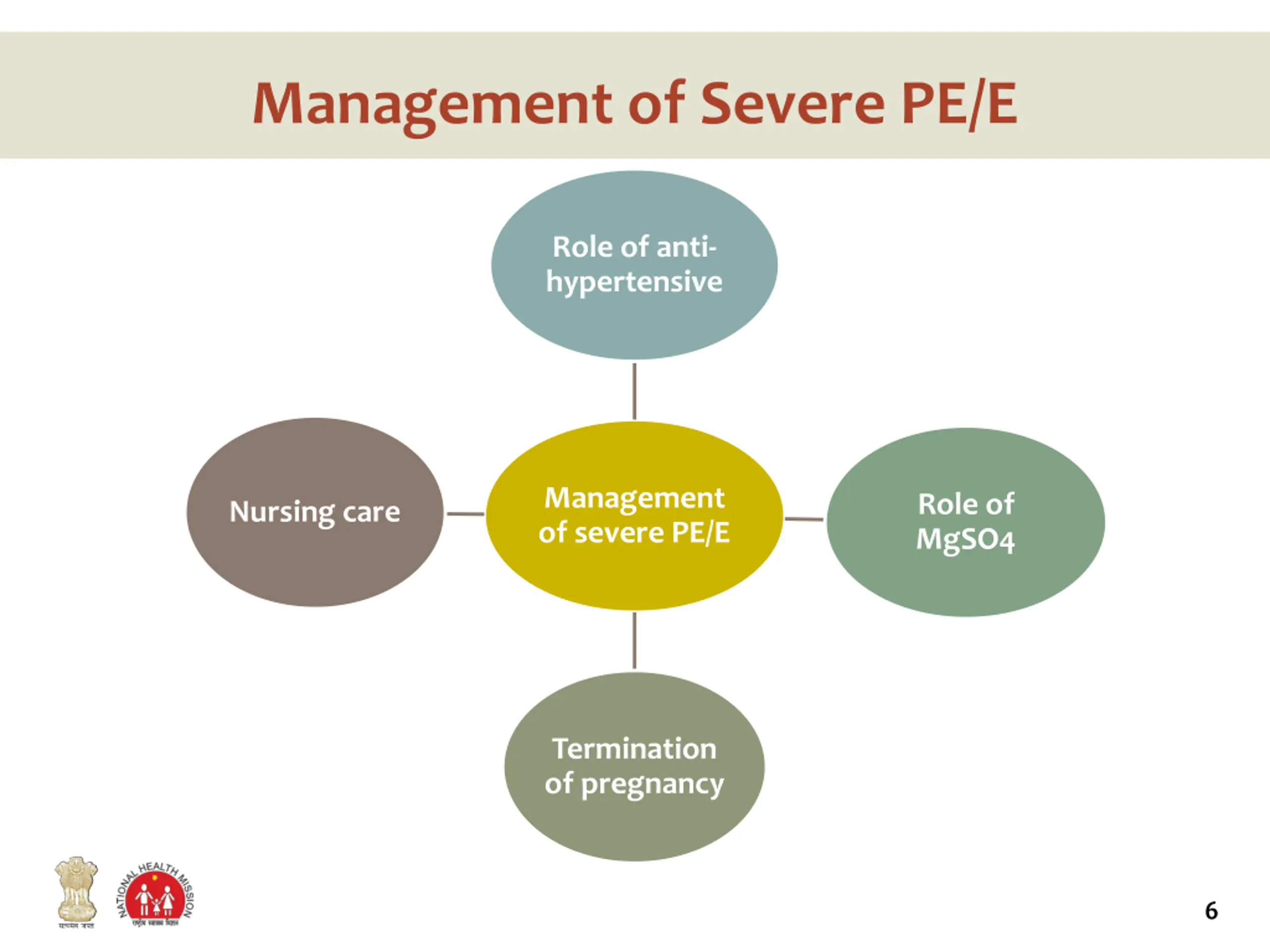 Management of Severe PE/E Role of anti- hypertensive Management of severe PE/E Role of MgSO4 Nursing care Termination of pregnancy 6
