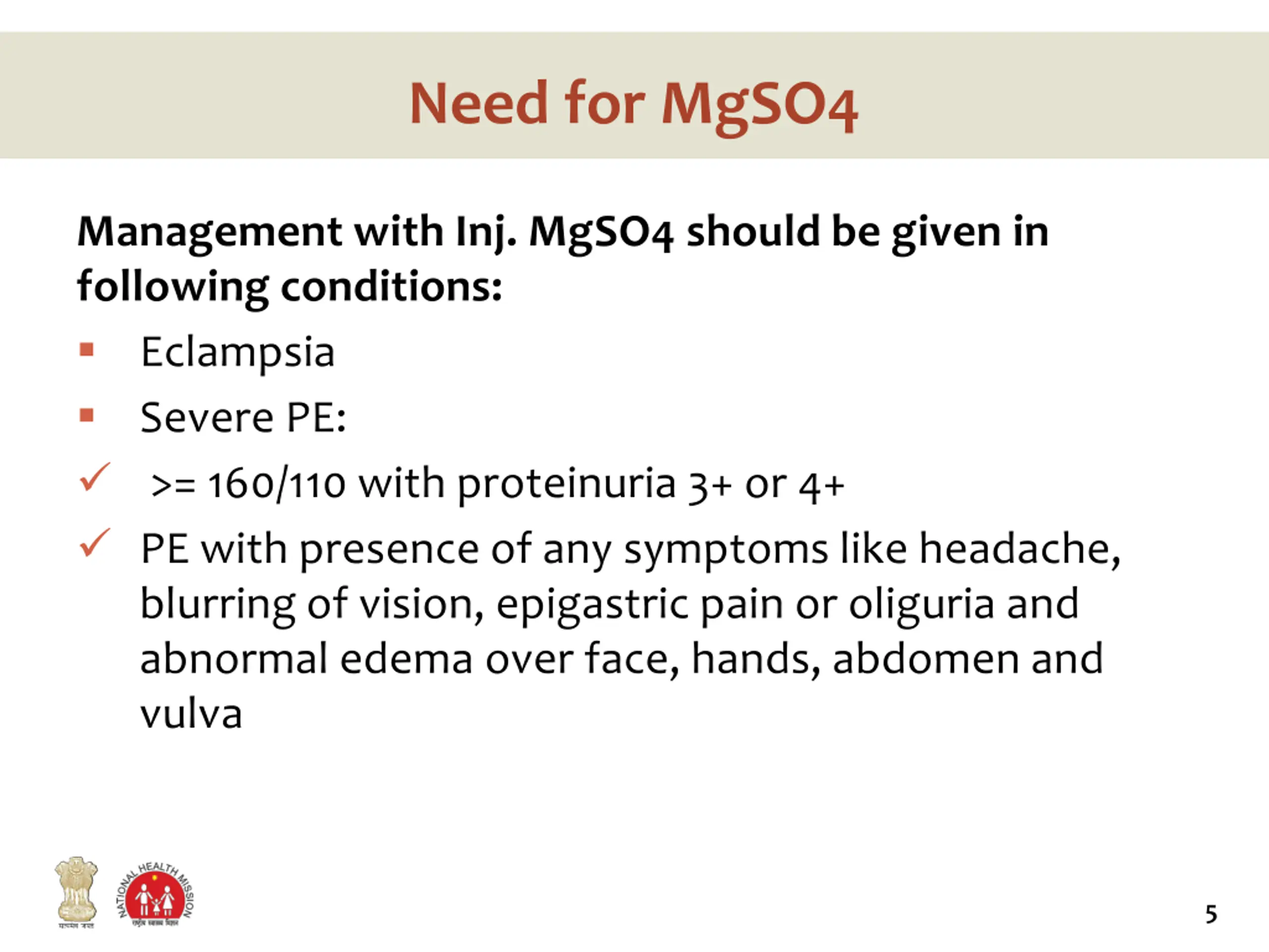 Need for MgSO4 Management with Inj. MgSO4 should be given in following conditions: Eclampsia Severe PE: >= 160/110 with proteinuria 3+ or 4+ PE with presence of any symptoms like headache, blurring of vision, epigastric pain or oliguria and abnormal edema over face, hands, abdomen and vulva 5