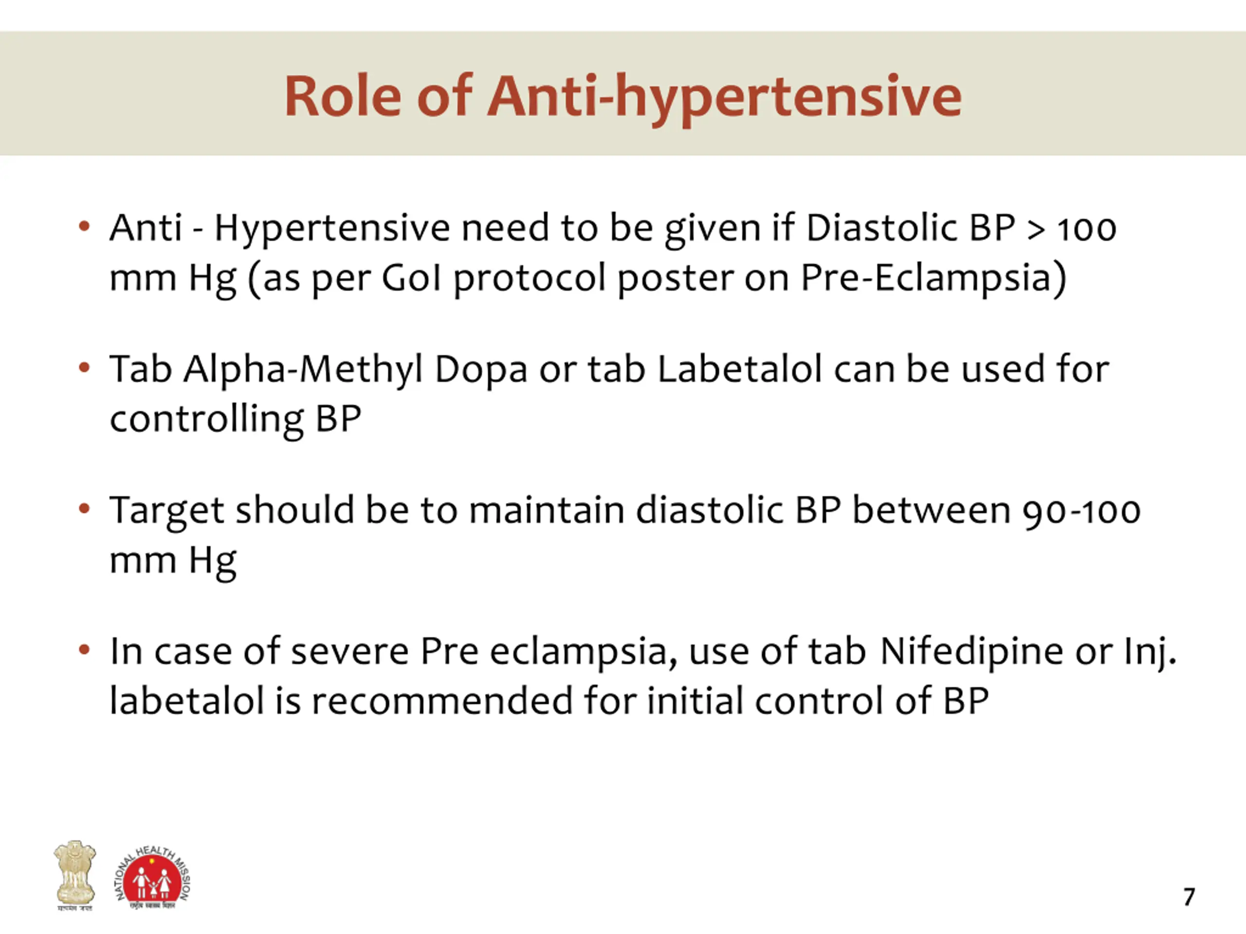 Role of Anti-hypertensive Anti - Hypertensive need to be given if Diastolic BP > 100 mm Hg (as per GoI protocol poster on Pre-Eclampsia) Tab Alpha-Methyl Dopa or tab Labetalol can be used for controlling BP Target should be to maintain diastolic BP between 90-100 mm Hg In case of severe Pre eclampsia, use of tab Nifedipine or Inj. labetalol is recommended for initial control of BP 7