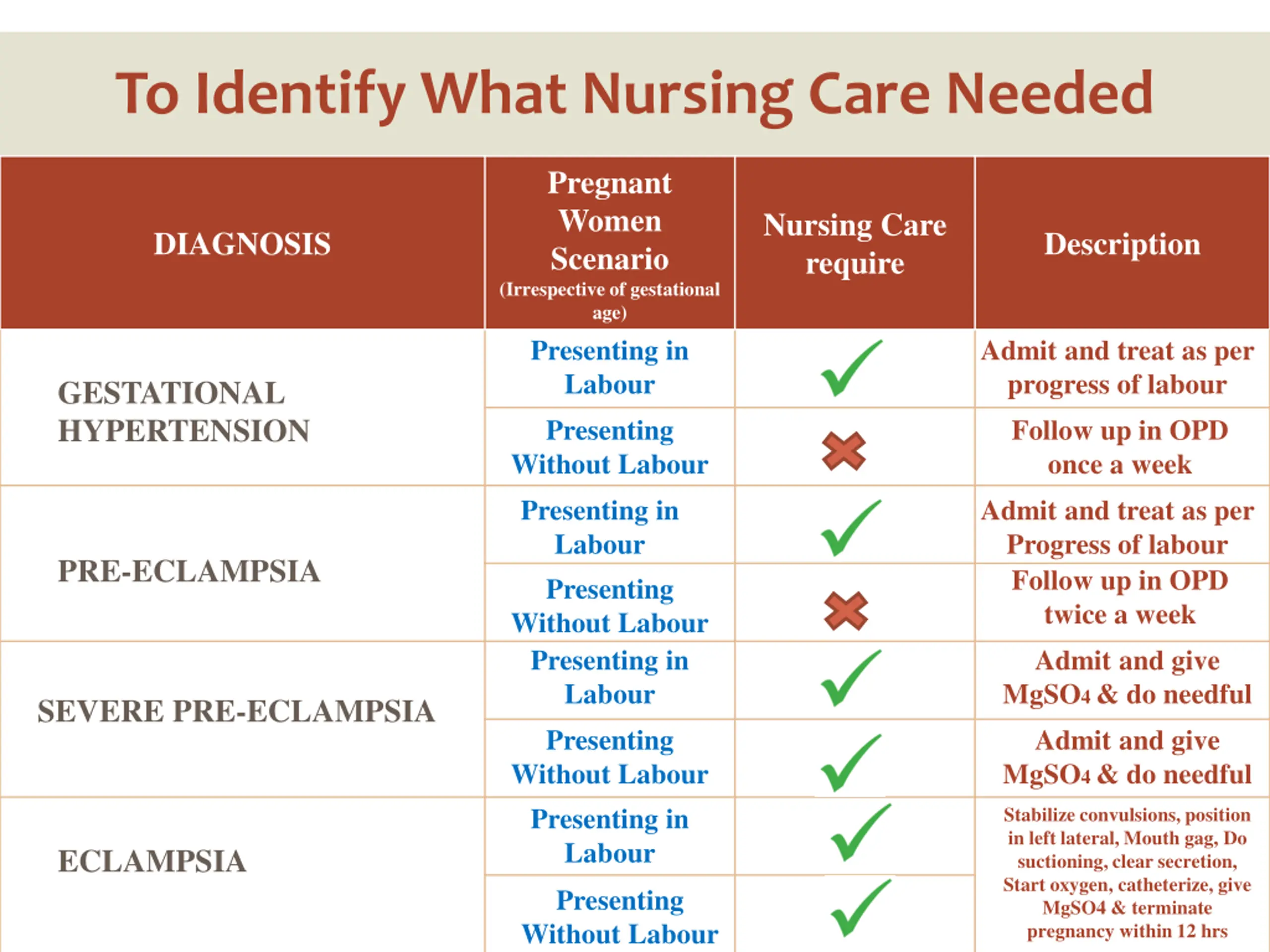 To Identify What Nursing Care Needed Pregnant Women Scenario (Irrespective of gestational age) Presenting in Labour Presenting Without Labour Presenting in Labour Presenting Without Labour Nursing Care require DIAGNOSIS Description Admit and treat as per progress of labour Follow up in OPD once a week Admit and treat as per Progress of labour Follow up in OPD twice a week Admit and give MgSO4 & do needful Admit and give MgSO4 & do needful GESTATIONAL HYPERTENSION PRE-ECLAMPSIA Presenting in Labour Presenting Without Labour SEVERE PRE-ECLAMPSIA Presenting in Labour Stabilize convulsions, position in left lateral, Mouth gag, Do suctioning, clear secretion, Start oxygen, catheterize, give MgSO4 & terminate pregnancy within 12 hrs ECLAMPSIA Presenting Without Labour