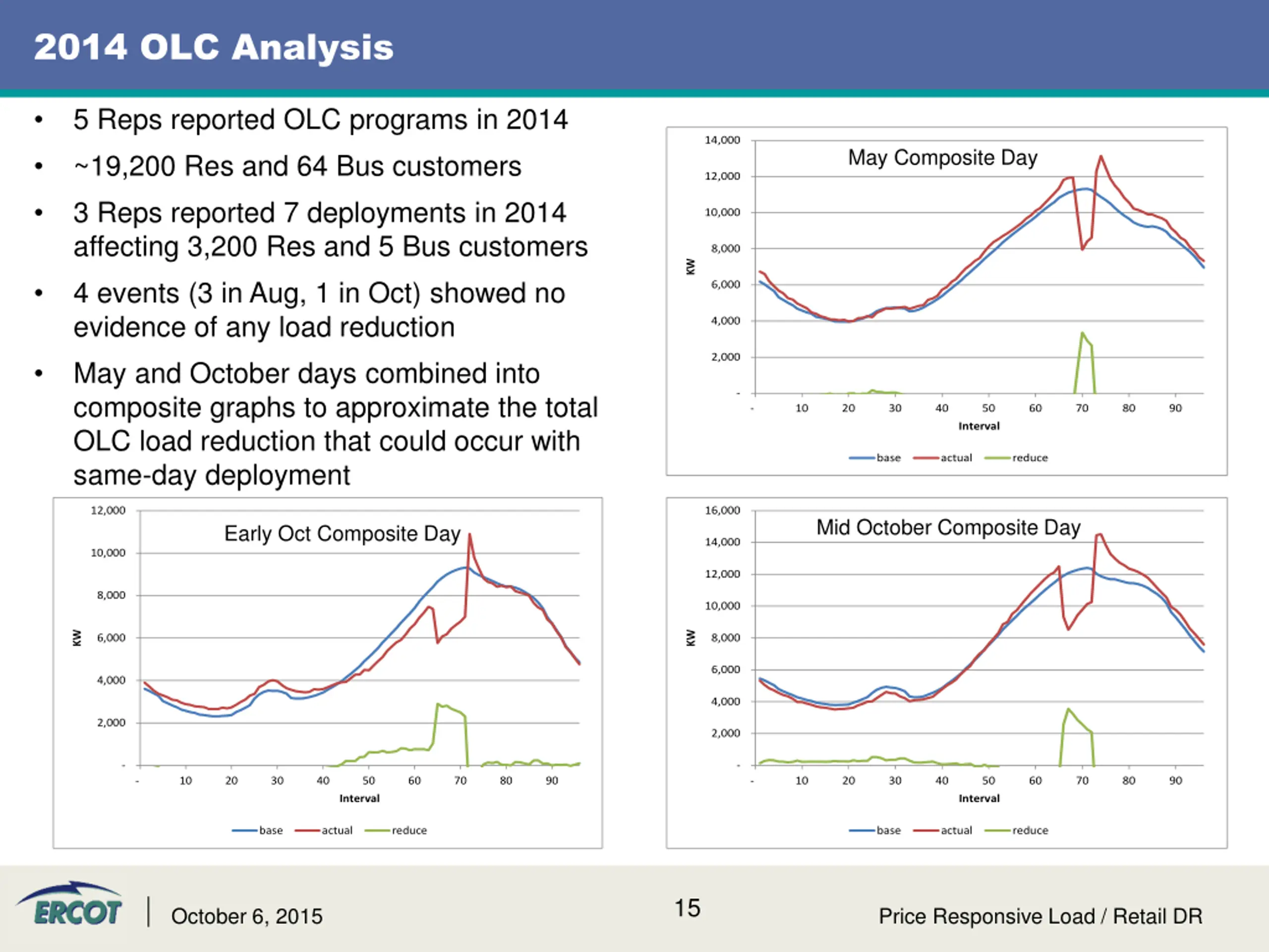 2014 OLC Analysis 5 Reps reported OLC programs in 2014 ~19,200 Res and 64 Bus customers 3 Reps reported 7 deployments in 2014 affecting 3,200 Res and 5 Bus customers 4 events (3 in Aug, 1 in Oct) showed no evidence of any load reduction May and October days combined into composite graphs to approximate the total OLC load reduction that could occur with same-day deployment 14,000 May Composite Day 12,000 10,000 8,000 KW 6,000 4,000 2,000 - - 10 20 30 40 50 60 70 80 90 Interval base actual reduce 12,000 16,000 Mid October Composite Day Early Oct Composite Day 14,000 10,000 12,000 8,000 10,000 KW KW 6,000 8,000 6,000 4,000 4,000 2,000 2,000 - - - 10 20 30 40 50 60 70 80 90 - 10 20 30 40 50 60 70 80 90 Interval Interval base actual reduce base actual reduce 15 October 6, 2015 Price Responsive Load / Retail DR