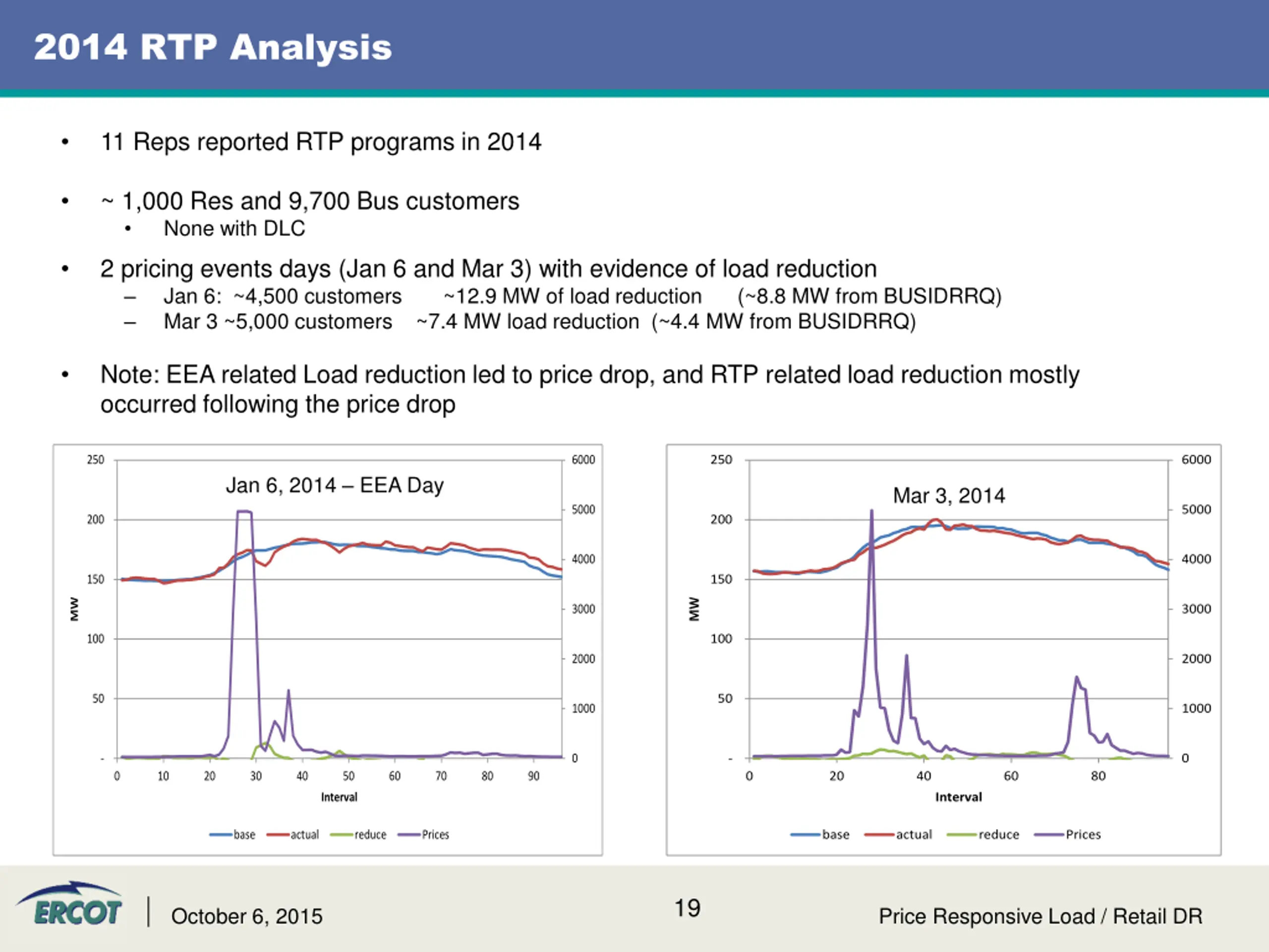 2014 RTP Analysis 11 Reps reported RTP programs in 2014 ~ 1,000 Res and 9,700 Bus customers None with DLC 2 pricing events days (Jan 6 and Mar 3) with evidence of load reduction Jan 6: ~4,500 customers ~12.9 MW of load reduction (~8.8 MW from BUSIDRRQ) Mar 3 ~5,000 customers ~7.4 MW load reduction (~4.4 MW from BUSIDRRQ) Note: EEA related Load reduction led to price drop, and RTP related load reduction mostly occurred following the price drop 250 6000 250 6000 Jan 6, 2014 EEA Day Mar 3, 2014 5000 5000 200 200 4000 4000 150 150 MW MW 3000 3000 100 100 2000 2000 50 50 1000 1000 - 0 - 0 0 10 20 30 40 50 60 70 80 90 0 20 40 60 80 Interval Interval base actual reduce Prices base actual reduce Prices 19 October 6, 2015 Price Responsive Load / Retail DR