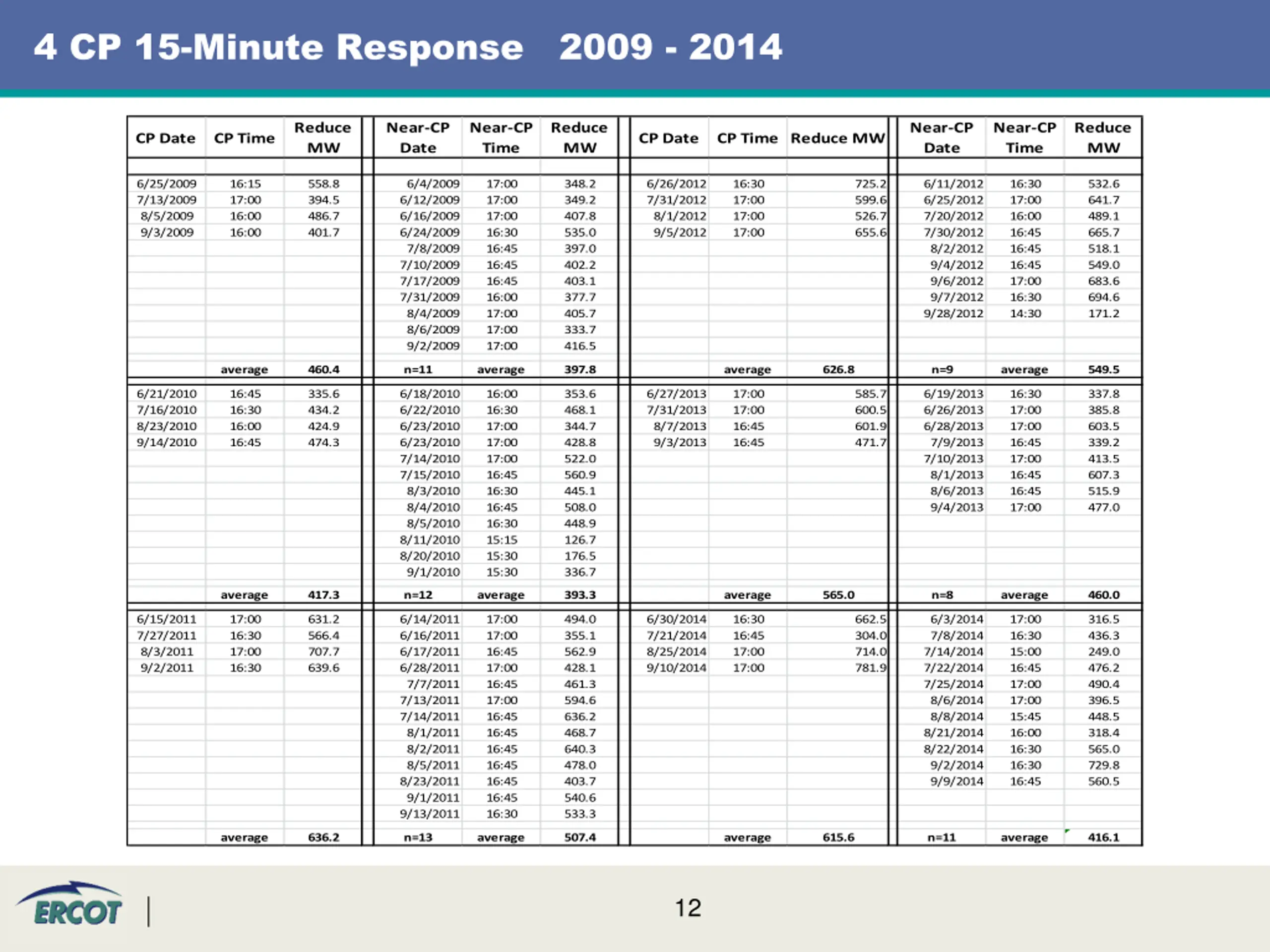4 CP 15-Minute Response 2009 - 2014 Reduce MW Near-CP Date Near-CP Time Reduce MW Near-CP Date Near-CP Time Reduce MW CP Date CP Time CP Date CP Time Reduce MW 6/25/2009 7/13/2009 8/5/2009 9/3/2009 16:15 17:00 16:00 16:00 558.8 394.5 486.7 401.7 6/4/2009 6/12/2009 6/16/2009 6/24/2009 7/8/2009 7/10/2009 7/17/2009 7/31/2009 8/4/2009 8/6/2009 9/2/2009 17:00 17:00 17:00 16:30 16:45 16:45 16:45 16:00 17:00 17:00 17:00 348.2 349.2 407.8 535.0 397.0 402.2 403.1 377.7 405.7 333.7 416.5 6/26/2012 7/31/2012 8/1/2012 9/5/2012 16:30 17:00 17:00 17:00 725.2 599.6 526.7 655.6 6/11/2012 6/25/2012 7/20/2012 7/30/2012 8/2/2012 9/4/2012 9/6/2012 9/7/2012 9/28/2012 16:30 17:00 16:00 16:45 16:45 16:45 17:00 16:30 14:30 532.6 641.7 489.1 665.7 518.1 549.0 683.6 694.6 171.2 average 460.4 n=11 average 397.8 average 626.8 n=9 average 549.5 6/21/2010 7/16/2010 8/23/2010 9/14/2010 16:45 16:30 16:00 16:45 335.6 434.2 424.9 474.3 6/18/2010 6/22/2010 6/23/2010 6/23/2010 7/14/2010 7/15/2010 8/3/2010 8/4/2010 8/5/2010 8/11/2010 8/20/2010 9/1/2010 16:00 16:30 17:00 17:00 17:00 16:45 16:30 16:45 16:30 15:15 15:30 15:30 353.6 468.1 344.7 428.8 522.0 560.9 445.1 508.0 448.9 126.7 176.5 336.7 6/27/2013 7/31/2013 8/7/2013 9/3/2013 17:00 17:00 16:45 16:45 585.7 600.5 601.9 471.7 6/19/2013 6/26/2013 6/28/2013 7/9/2013 7/10/2013 8/1/2013 8/6/2013 9/4/2013 16:30 17:00 17:00 16:45 17:00 16:45 16:45 17:00 337.8 385.8 603.5 339.2 413.5 607.3 515.9 477.0 average 417.3 n=12 average 393.3 average 565.0 n=8 average 460.0 6/15/2011 7/27/2011 8/3/2011 9/2/2011 17:00 16:30 17:00 16:30 631.2 566.4 707.7 639.6 6/14/2011 6/16/2011 6/17/2011 6/28/2011 7/7/2011 7/13/2011 7/14/2011 8/1/2011 8/2/2011 8/5/2011 8/23/2011 9/1/2011 9/13/2011 17:00 17:00 16:45 17:00 16:45 17:00 16:45 16:45 16:45 16:45 16:45 16:45 16:30 494.0 355.1 562.9 428.1 461.3 594.6 636.2 468.7 640.3 478.0 403.7 540.6 533.3 6/30/2014 7/21/2014 8/25/2014 9/10/2014 16:30 16:45 17:00 17:00 662.5 304.0 714.0 781.9 6/3/2014 7/8/2014 7/14/2014 7/22/2014 7/25/2014 8/6/2014 8/8/2014 8/21/2014 8/22/2014 9/2/2014 9/9/2014 17:00 16:30 15:00 16:45 17:00 17:00 15:45 16:00 16:30 16:30 16:45 316.5 436.3 249.0 476.2 490.4 396.5 448.5 318.4 565.0 729.8 560.5 average 636.2 n=13 average 507.4 average 615.6 n=11 average 416.1 12