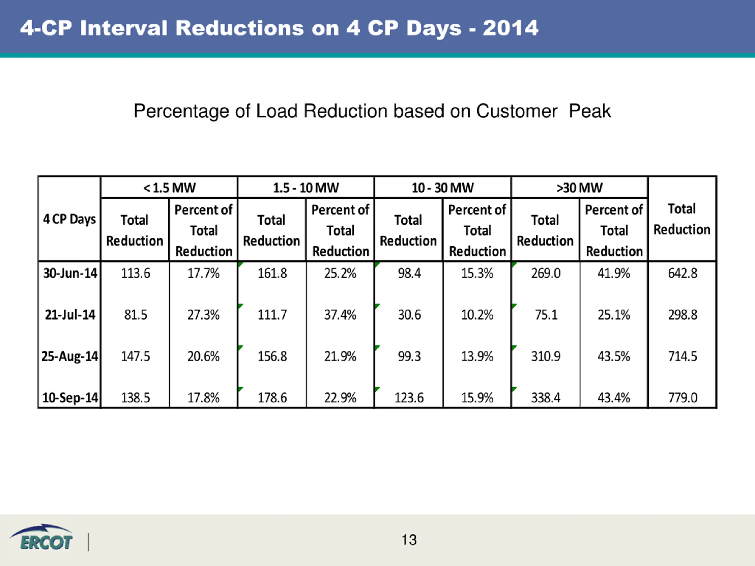 4-CP Interval Reductions on 4 CP Days - 2014 Percentage of Load Reduction based on Customer Peak < 1.5 MW 1.5 - 10 MW 10 - 30 MW >30 MW Total Reduction Percent of Total Reduction 17.7% Percent of Total Reduction 25.2% Percent of Total Reduction 15.3% Percent of Total Reduction 41.9% 4 CP Days Total Reduction Total Reduction Total Reduction Total Reduction 30-Jun-14 113.6 161.8 98.4 269.0 642.8 21-Jul-14 81.5 27.3% 111.7 37.4% 30.6 10.2% 75.1 25.1% 298.8 25-Aug-14 147.5 20.6% 156.8 21.9% 99.3 13.9% 310.9 43.5% 714.5 10-Sep-14 138.5 17.8% 178.6 22.9% 123.6 15.9% 338.4 43.4% 779.0 13