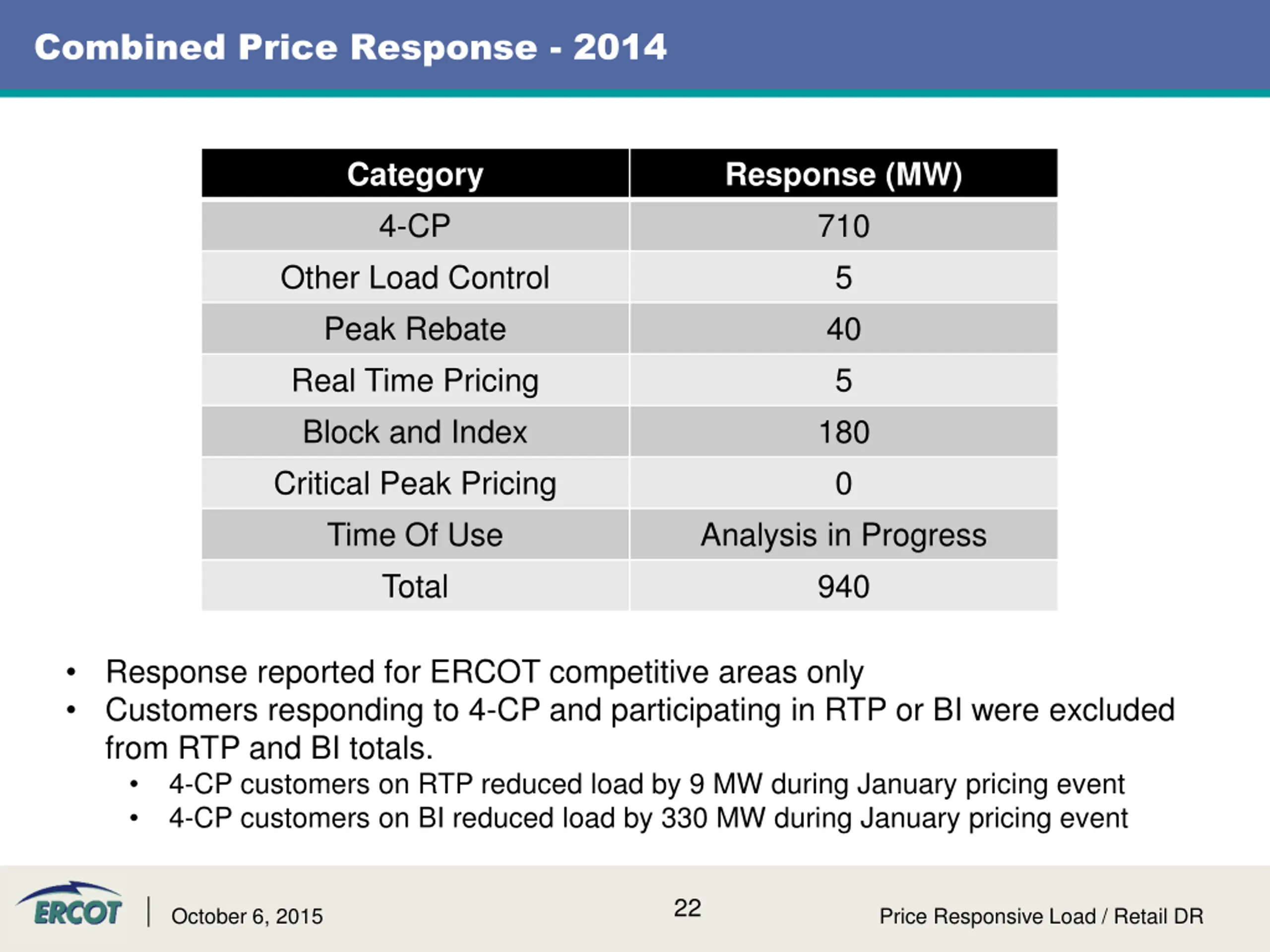 Updated Categories pg. 3 of 3 Demand Response category definitions: NOTE will not use 4CP and FO categories for summer 2015 data collection 4CP Four Coincident Peak predictor signals or direct load control provided to customers in advance of potential Four Coincident Peak (4CP) intervals during summer months (June through September). Reducing load during such intervals lowers transmission charges. 4CP charges apply to large customers (peak demand 700 kW) in competitive choice areas, and also to NOIEs at the boundary meter level. FO Financial Option product where LSE purchases an option from the customer that is backed by a specified level of DR and uses it for portfolio trades in the wholesale market. 4CP - ERCOT can do the 4CP analysis without the need to ask the LSEs to provide data in the survey. FO category has not been used for 2 years 25 October 6, 2015 Price Responsive Load / Retail DR