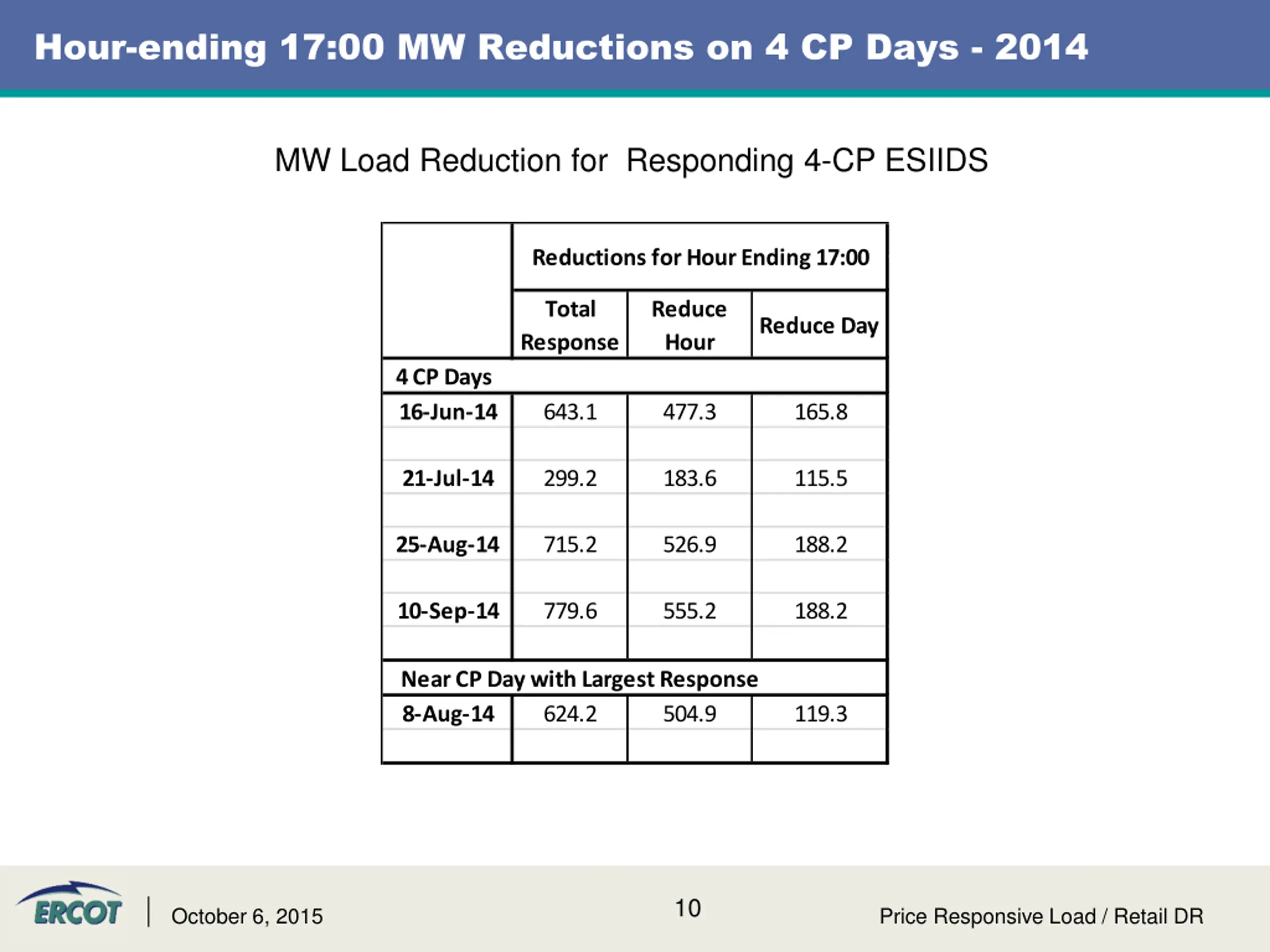 Number of ESIIDs with 4 CP Responses 2014 Response Type Reduce Hour 1,447 Reduce Day 395 Total Respond Non Respond 11,306 4 CP Days 30-Jun-14 1,842 21-Jul-14 1,211 406 1,617 11,534 25-Aug-14 1,568 415 1,983 11,176 10-Sep-14 1,417 389 1,806 11,343 9 October 6, 2015 Price Responsive Load / Retail DR