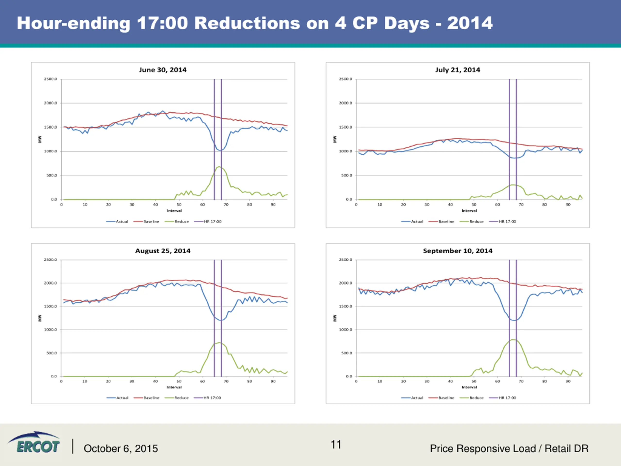 Hour-ending 17:00 MW Reductions on 4 CP Days - 2014 MW Load Reduction for Responding 4-CP ESIIDS Reductions for Hour Ending 17:00 Total Response Reduce Hour Reduce Day 4 CP Days 16-Jun-14 643.1 477.3 165.8 21-Jul-14 299.2 183.6 115.5 25-Aug-14 715.2 526.9 188.2 10-Sep-14 779.6 555.2 188.2 Near CP Day with Largest Response 8-Aug-14 624.2 504.9 119.3 10 October 6, 2015 Price Responsive Load / Retail DR
