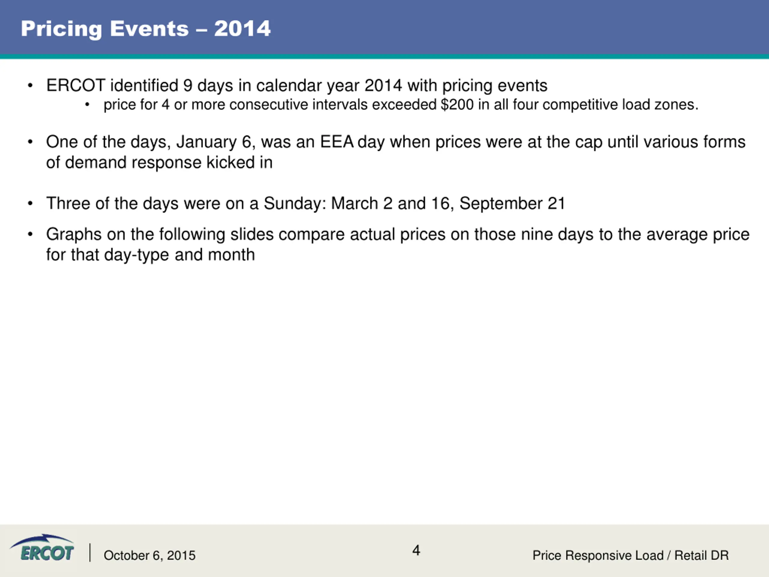 Pricing Events 2014 ERCOT identified 9 days in calendar year 2014 with pricing events price for 4 or more consecutive intervals exceeded $200 in all four competitive load zones. One of the days, January 6, was an EEA day when prices were at the cap until various forms of demand response kicked in Three of the days were on a Sunday: March 2 and 16, September 21 Graphs on the following slides compare actual prices on those nine days to the average price for that day-type and month 4 October 6, 2015 Price Responsive Load / Retail DR