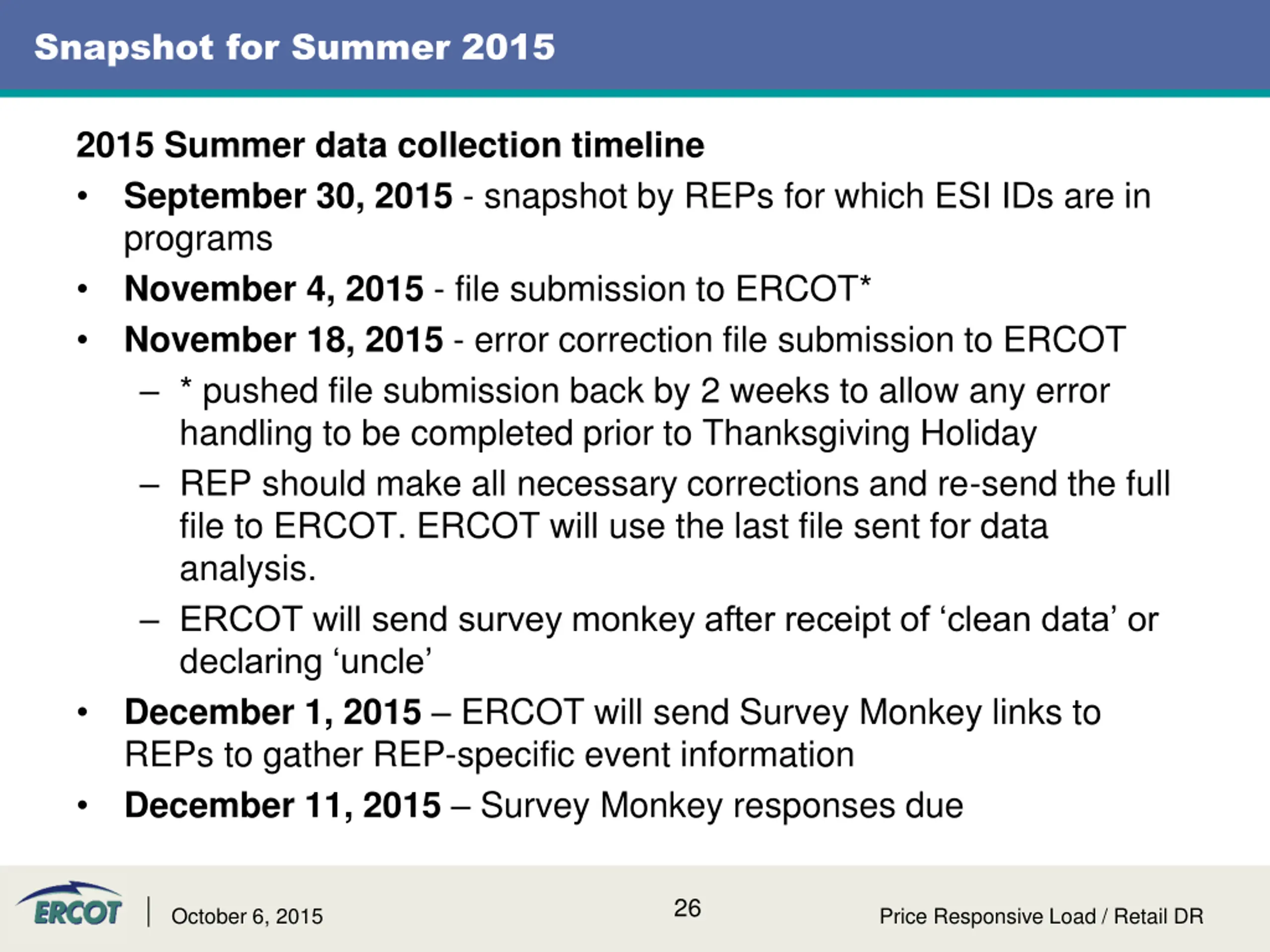 Snapshot for Summer 2015 2015 Summer data collection timeline September 30, 2015 - snapshot by REPs for which ESI IDs are in programs November 4, 2015 - file submission to ERCOT* November 18, 2015 - error correction file submission to ERCOT * pushed file submission back by 2 weeks to allow any error handling to be completed prior to Thanksgiving Holiday REP should make all necessary corrections and re-send the full file to ERCOT. ERCOT will use the last file sent for data analysis. ERCOT will send survey monkey after receipt of clean data or declaring uncle December 1, 2015 ERCOT will send Survey Monkey links to REPs to gather REP-specific event information December 11, 2015 Survey Monkey responses due 26 October 6, 2015 Price Responsive Load / Retail DR