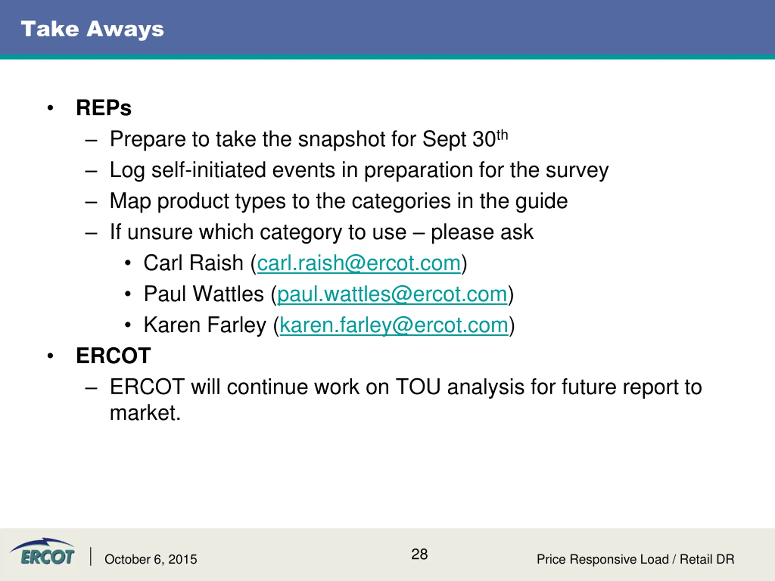 Next Steps for future Still for future discussion Future years (starting 2016?) Evaluate quarterly submissions for 2016 Ask REPs to evaluate winter programs for future consideration Please review categories to see if definitions fit or if new categories would need to be added Consider possible dates and/or frequency of a winter file submission Protocol Revision and/or Market Guide Revision? Review categories each year to see if adjustments need to be made Review reporting of events via Survey Monkey to see if there is a better method to leverage 27 October 6, 2015 Price Responsive Load / Retail DR