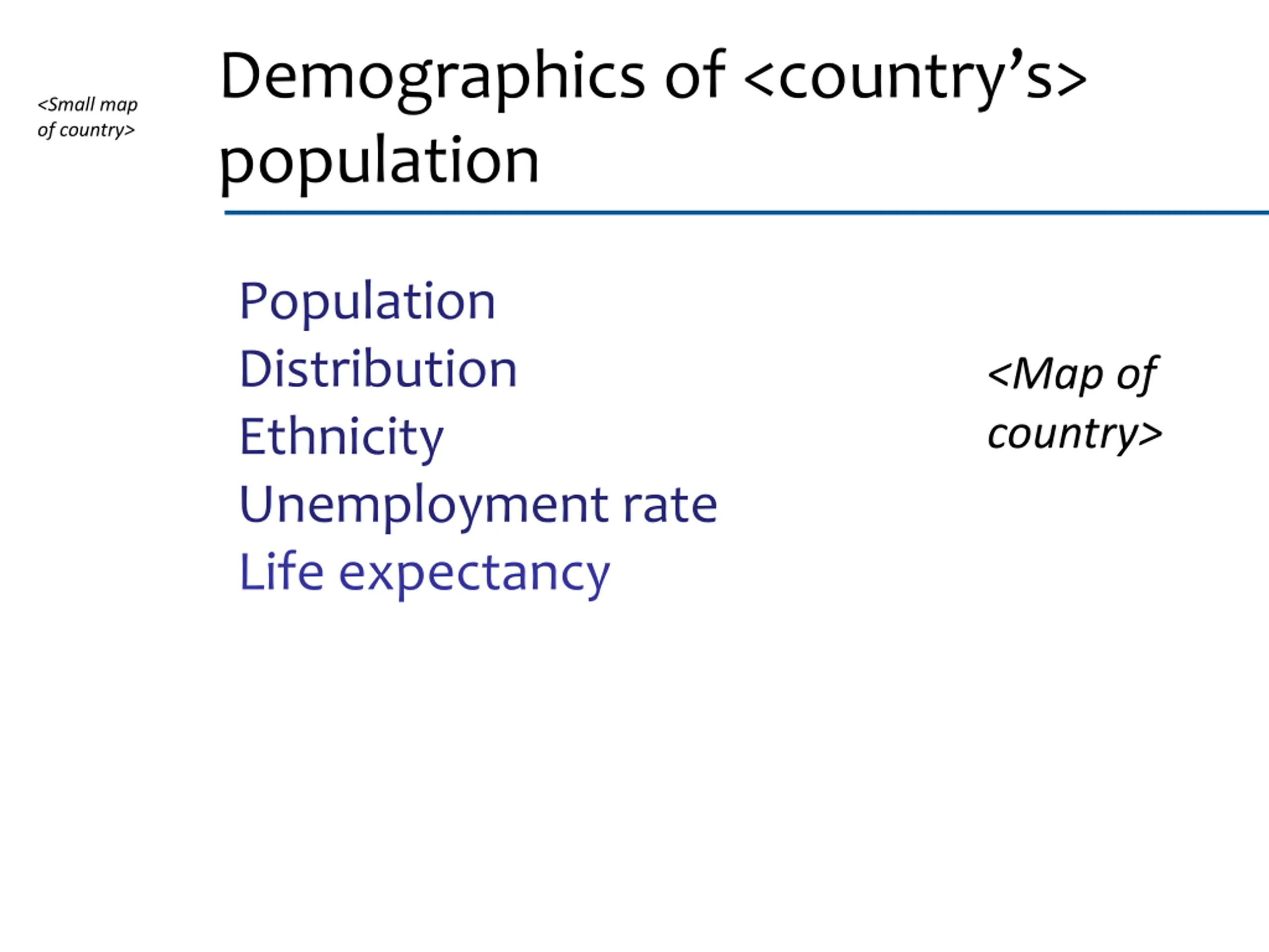 Demographics of <countrys> population <Small map of country> Population Distribution Ethnicity Unemployment rate Life expectancy <Map of country>