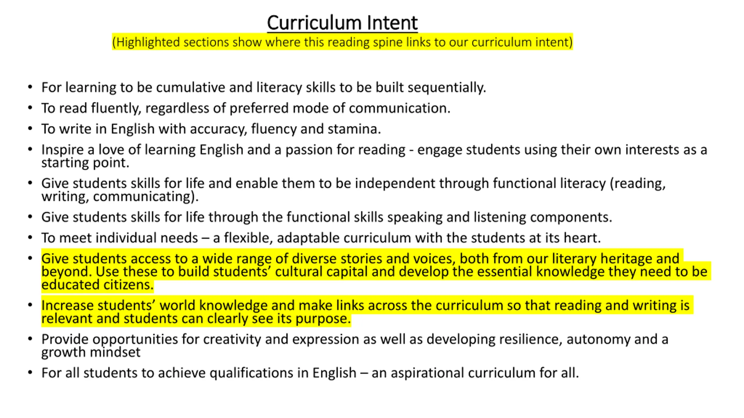 Curriculum Intent Curriculum Intent (Highlighted sections show where this reading spine links to our curriculum intent) For learning to be cumulative and literacy skills to be built sequentially. To read fluently, regardless of preferred mode of communication. To write in English with accuracy, fluency and stamina. Inspire a love of learning English and a passion for reading - engage students using their own interests as a starting point. Give students skills for life and enable them to be independent through functional literacy (reading, writing, communicating). Give students skills for life through the functional skills speaking and listening components. To meet individual needs a flexible, adaptable curriculum with the students at its heart. Give students access to a wide range of diverse stories and voices, both from our literary heritage and beyond. Use these to build students cultural capital and develop the essential knowledge they need to be educated citizens. Increase students world knowledge and make links across the curriculum so that reading and writing is relevant and students can clearly see its purpose. Provide opportunities for creativity and expression as well as developing resilience, autonomy and a growth mindset For all students to achieve qualifications in English an aspirational curriculum for all.