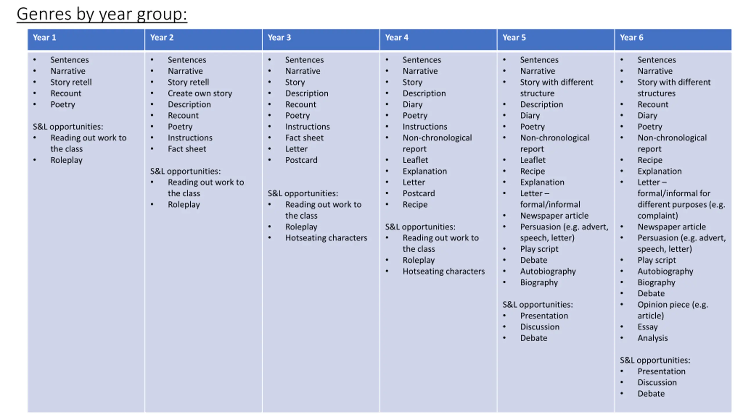 Genres by year group: Year 1 Year 2 Year 3 Year 4 Year 5 Year 6 Sentences Narrative Story retell Recount Poetry Sentences Narrative Story retell Create own story Description Recount Poetry Instructions Fact sheet Sentences Narrative Story Description Recount Poetry Instructions Fact sheet Letter Postcard Sentences Narrative Story Description Diary Poetry Instructions Non-chronological report Leaflet Explanation Letter Postcard Recipe Sentences Narrative Story with different structure Description Diary Poetry Non-chronological report Leaflet Recipe Explanation Letter formal/informal Newspaper article Persuasion (e.g. advert, speech, letter) Play script Debate Autobiography Biography Sentences Narrative Story with different structures Recount Diary Poetry Non-chronological report Recipe Explanation Letter formal/informal for different purposes (e.g. complaint) Newspaper article Persuasion (e.g. advert, speech, letter) Play script Autobiography Biography Debate Opinion piece (e.g. article) Essay Analysis S&L opportunities: Reading out work to the class Roleplay S&L opportunities: Reading out work to the class Roleplay S&L opportunities: Reading out work to the class Roleplay Hotseating characters S&L opportunities: Reading out work to the class Roleplay Hotseating characters S&L opportunities: Presentation Discussion Debate S&L opportunities: Presentation Discussion Debate