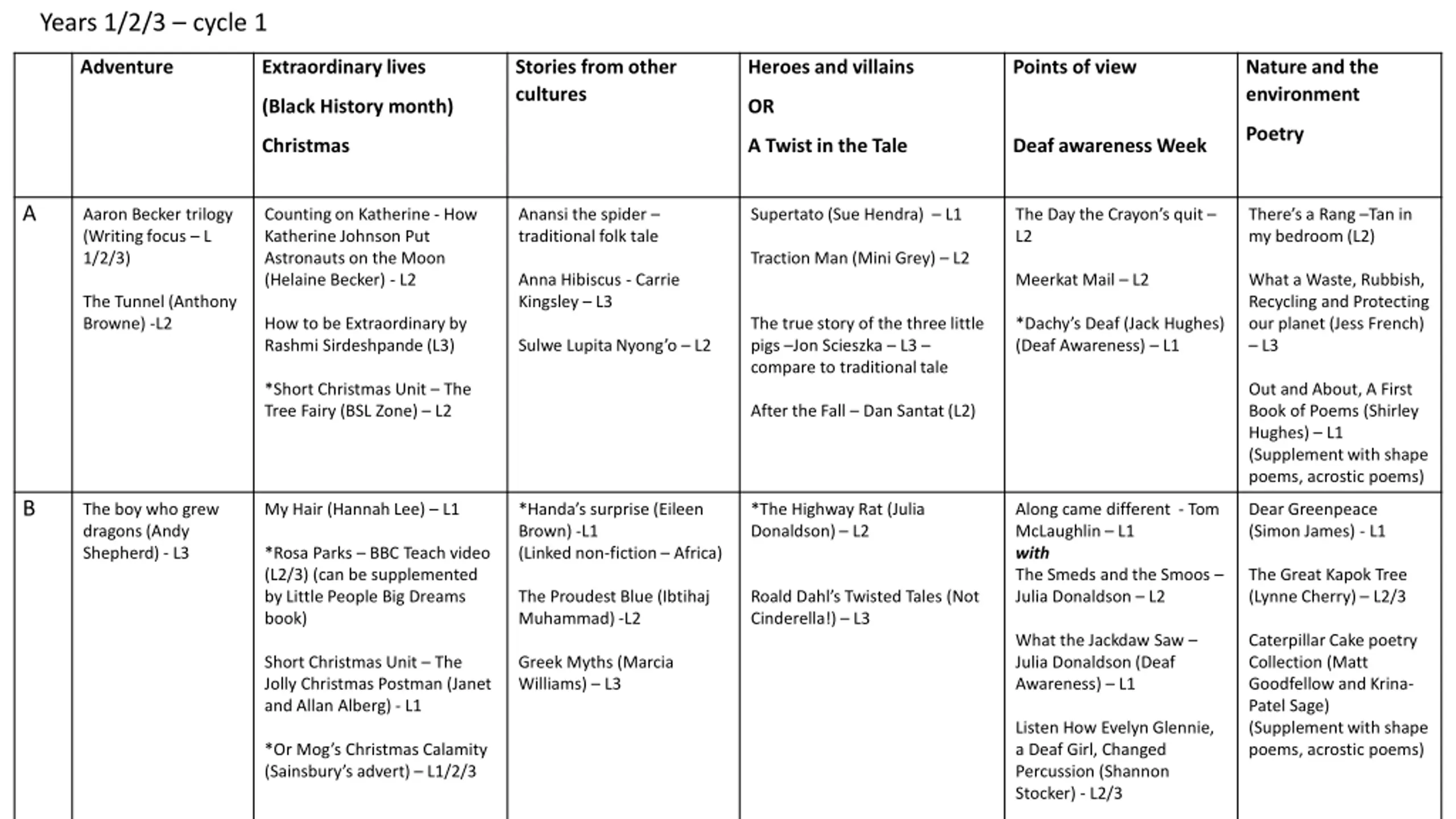 Years 1/2/3 cycle 1 Adventure Extraordinary lives Stories from other cultures Heroes and villains Points of view Nature and the environment (Black History month) OR Poetry Christmas A Twist in the Tale Deaf awareness Week A Aaron Becker trilogy (Writing focus L 1/2/3) Counting on Katherine - How Katherine Johnson Put Astronauts on the Moon (Helaine Becker) - L2 Anansi the spider traditional folk tale Supertato (Sue Hendra) L1 The Day the Crayon s quit L2 There s a Rang Tan in my bedroom (L2) Traction Man (Mini Grey) L2 Anna Hibiscus - Carrie Kingsley L3 Meerkat Mail L2 What a Waste, Rubbish, Recycling and Protecting our planet (Jess French) L3 The Tunnel (Anthony Browne) -L2 How to be Extraordinary by Rashmi Sirdeshpande (L3) The true story of the three little pigs Jon Scieszka L3 compare to traditional tale *Dachy s Deaf (Jack Hughes) (Deaf Awareness) L1 Sulwe Lupita Nyong o L2 *Short Christmas Unit The Tree Fairy (BSL Zone) L2 Out and About, A First Book of Poems (Shirley Hughes) L1 (Supplement with shape poems, acrostic poems) After the Fall Dan Santat (L2) B The boy who grew dragons (Andy Shepherd) - L3 My Hair (Hannah Lee) L1 *Handa s surprise (Eileen Brown) -L1 (Linked non-fiction Africa) *The Highway Rat (Julia Donaldson) L2 Along came different - Tom McLaughlin L1 with The Smeds and the Smoos Julia Donaldson L2 Dear Greenpeace (Simon James) - L1 *Rosa Parks BBC Teach video (L2/3) (can be supplemented by Little People Big Dreams book) The Great Kapok Tree (Lynne Cherry) L2/3 The Proudest Blue (Ibtihaj Muhammad) -L2 Roald Dahl s Twisted Tales (Not Cinderella!) L3 What the Jackdaw Saw Julia Donaldson (Deaf Awareness) L1 Caterpillar Cake poetry Collection (Matt Goodfellow and Krina- Patel Sage) (Supplement with shape poems, acrostic poems) Short Christmas Unit The Jolly Christmas Postman (Janet and Allan Alberg) - L1 Greek Myths (Marcia Williams) L3 Listen How Evelyn Glennie, a Deaf Girl, Changed Percussion (Shannon Stocker) - L2/3 *Or Mog s Christmas Calamity (Sainsbury s advert) L1/2/3