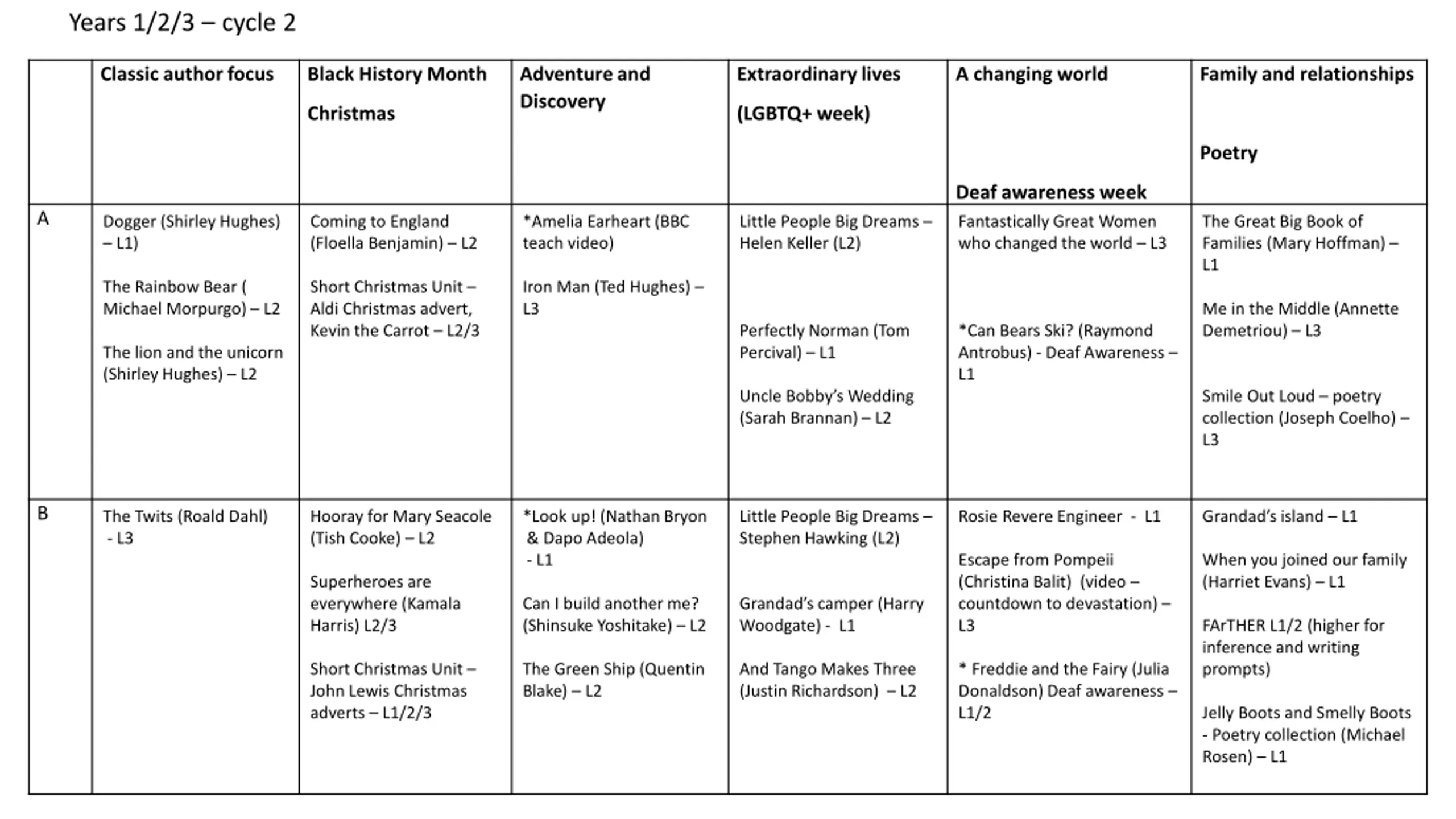 Years 1/2/3 cycle 2 Classic author focus Black History Month Adventure and Discovery Extraordinary lives A changing world Family and relationships Christmas (LGBTQ+ week) Poetry Deaf awareness week A Dogger (Shirley Hughes) L1) Coming to England (Floella Benjamin) L2 *Amelia Earheart (BBC teach video) Little People Big Dreams Helen Keller (L2) Fantastically Great Women who changed the world L3 The Great Big Book of Families (Mary Hoffman) L1 The Rainbow Bear ( Michael Morpurgo) L2 Short Christmas Unit Aldi Christmas advert, Kevin the Carrot L2/3 Iron Man (Ted Hughes) L3 Me in the Middle (Annette Demetriou) L3 Perfectly Norman (Tom Percival) L1 *Can Bears Ski? (Raymond Antrobus) - Deaf Awareness L1 The lion and the unicorn (Shirley Hughes) L2 Uncle Bobby s Wedding (Sarah Brannan) L2 Smile Out Loud poetry collection (Joseph Coelho) L3 B The Twits (Roald Dahl) - L3 Hooray for Mary Seacole (Tish Cooke) L2 *Look up! (Nathan Bryon & Dapo Adeola) - L1 Little People Big Dreams Stephen Hawking (L2) Rosie Revere Engineer - L1 Grandad s island L1 Escape from Pompeii (Christina Balit) (video countdown to devastation) L3 When you joined our family (Harriet Evans) L1 Superheroes are everywhere (Kamala Harris) L2/3 Can I build another me? (Shinsuke Yoshitake) L2 Grandad s camper (Harry Woodgate) - L1 FArTHER L1/2 (higher for inference and writing prompts) Short Christmas Unit John Lewis Christmas adverts L1/2/3 The Green Ship (Quentin Blake) L2 And Tango Makes Three (Justin Richardson) L2 * Freddie and the Fairy (Julia Donaldson) Deaf awareness L1/2 Jelly Boots and Smelly Boots - Poetry collection (Michael Rosen) L1