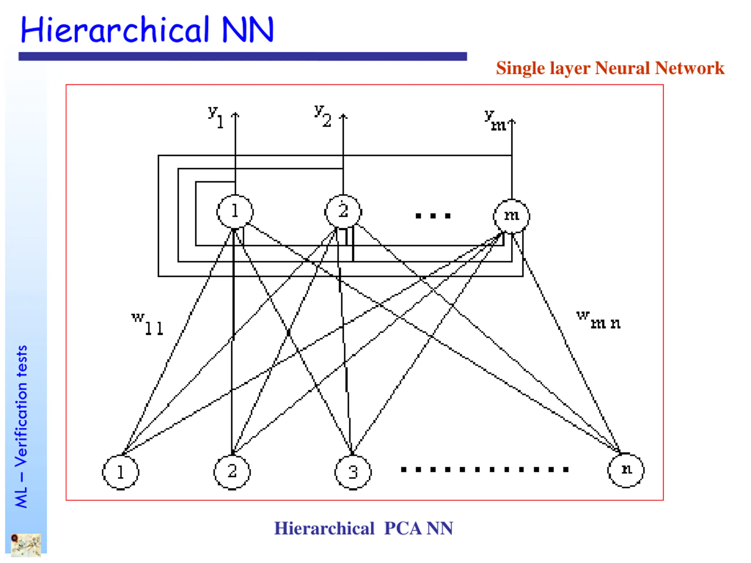 Unsupervised Neural Networks Typically Hebbian type learning rules are used There are two type of NN able to extract the Principal Components: Symmetric (Oja, 1989) ML Verification tests Hierarchical (Sanger, 1989)