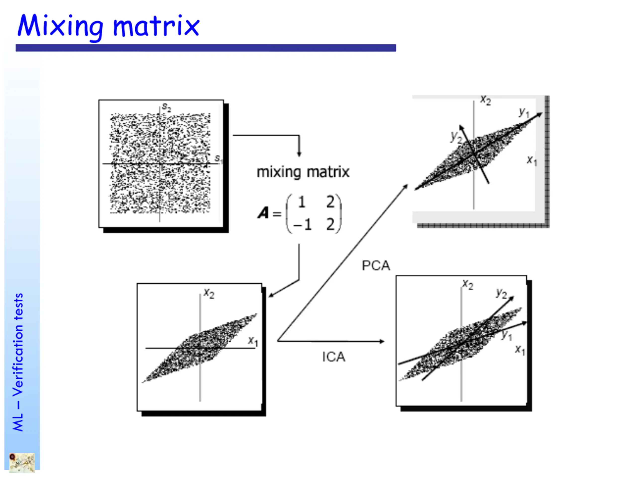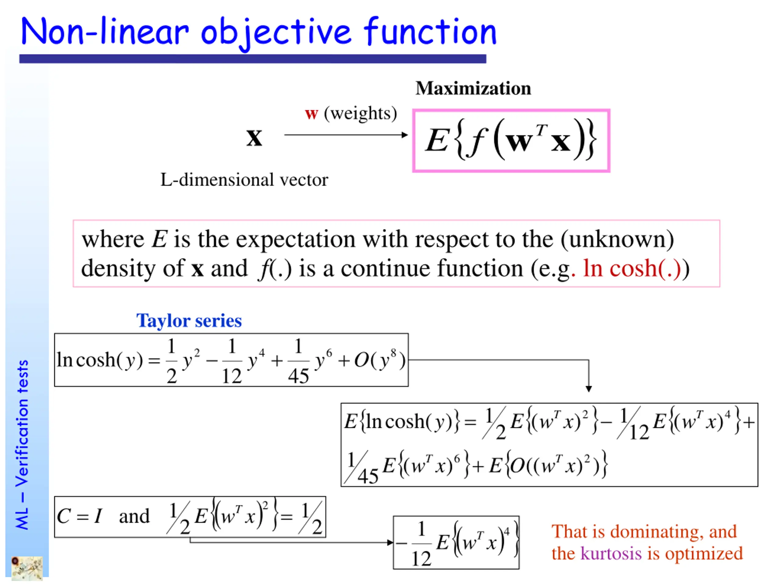 Non-linear objective function Maximization w (weights) ( ) x wT x E f L-dimensional vector where E is the expectation with respect to the (unknown) density of x and f(.) is a continue function (e.g. ln cosh(.)) Taylor series 1 1 1 = + + 2 4 6 8 ln cosh( ) ( ) y y y y O y ML Verification tests 2 12 45 ) 1 1 = + 2 4 T T ln cosh( ) ( ) ( ) E y E w x E w x 2 12 1 + 6 2 T T ( ) (( ) E w x E O w x 45 ( ) 1 1 2= = T and C I E w x 2 2 1 ( ) That is dominating, and the kurtosis is optimized 4 T E w x 12