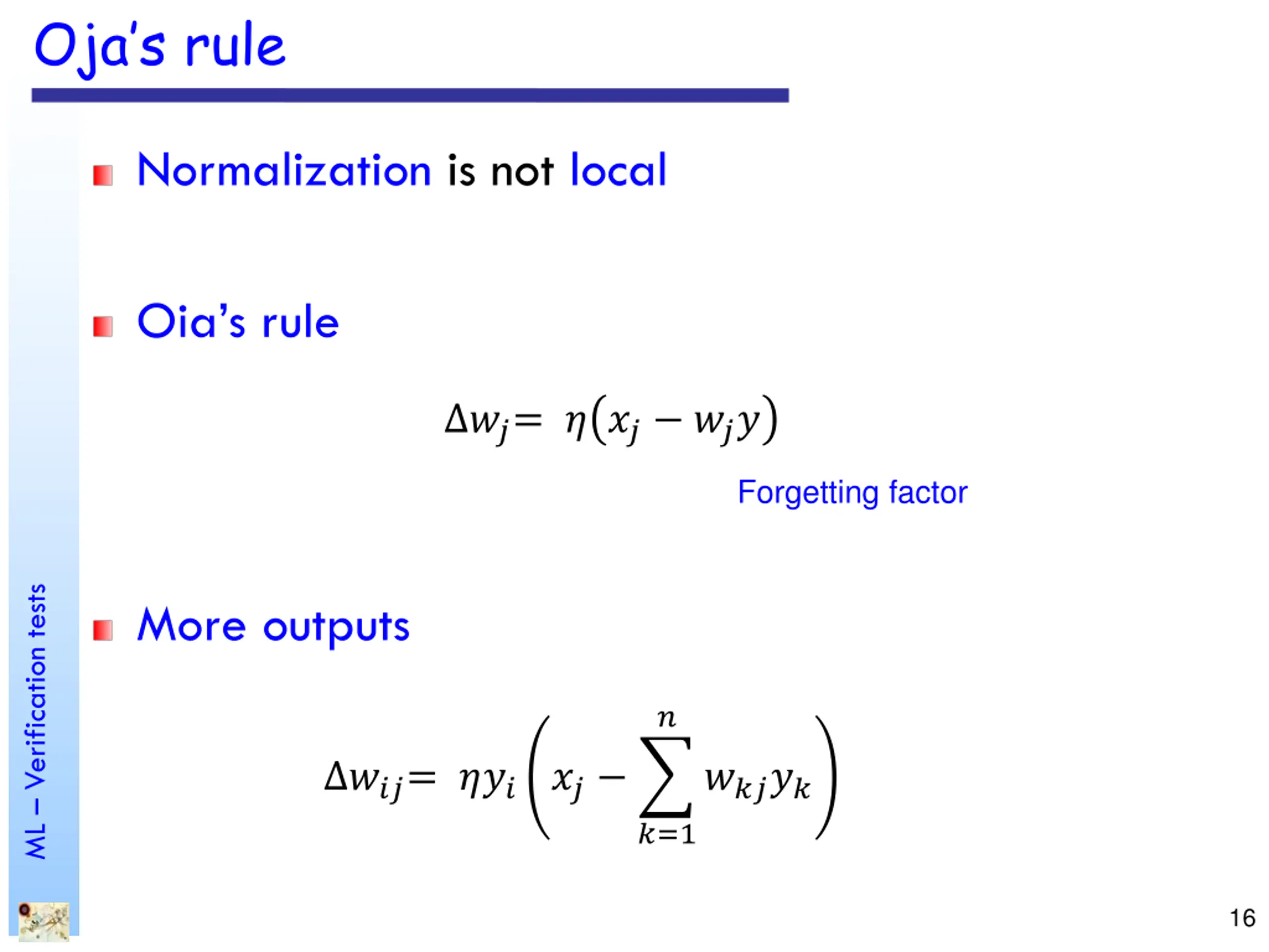 Ojas rule Normalization is not local Oia s rule ??= ? ?? ??? Forgetting factor ML Verification tests More outputs ? ???= ??? ?? ????? ?=1 16
