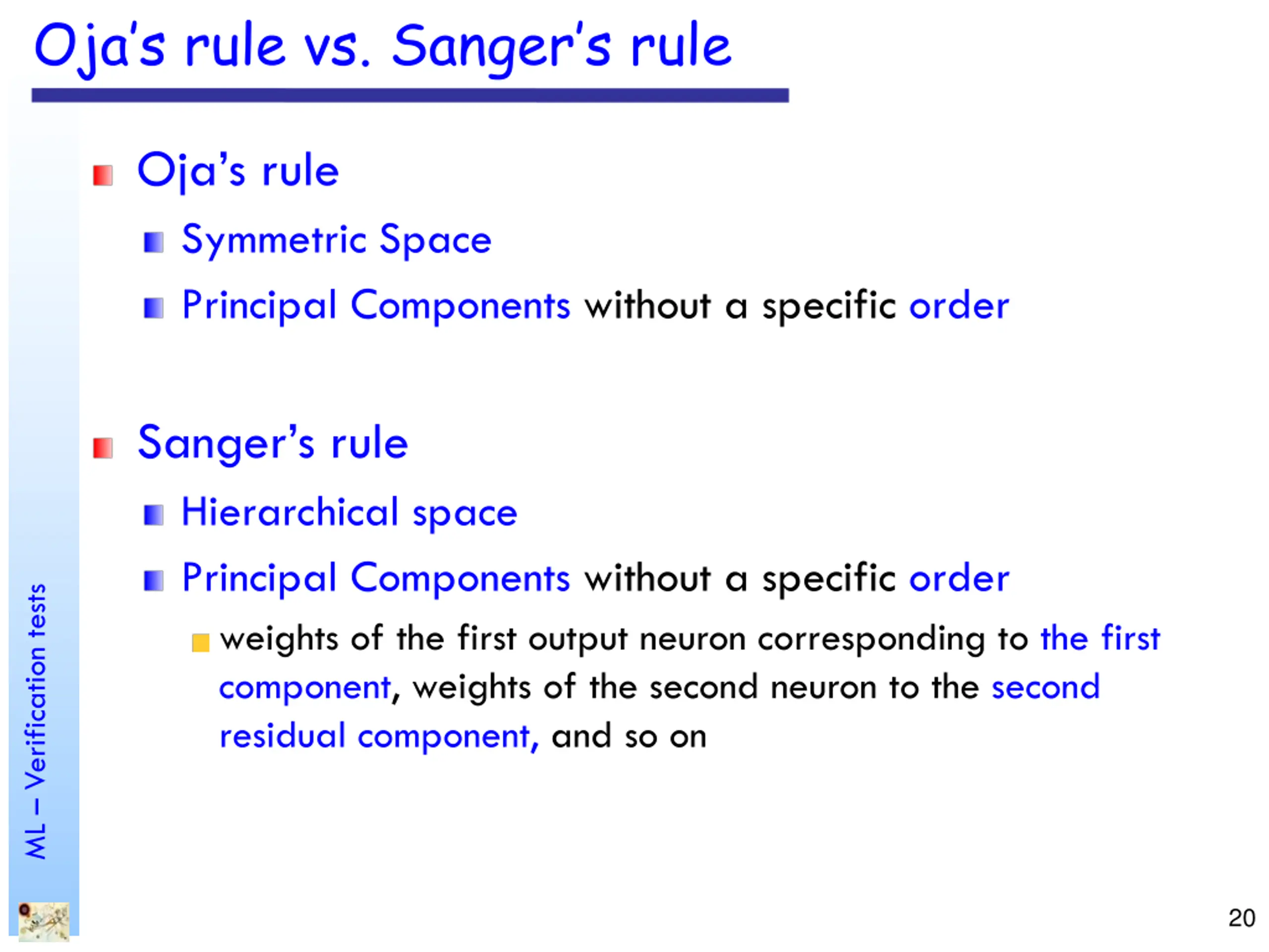 Ojas rule vs. Sangers rule Oja s rule Symmetric Space Principal Components without a specific order Sanger s rule Hierarchical space Principal Components without a specific order weights of the first output neuron corresponding to the first component, weights of the second neuron to the second residual component, and so on ML Verification tests 20