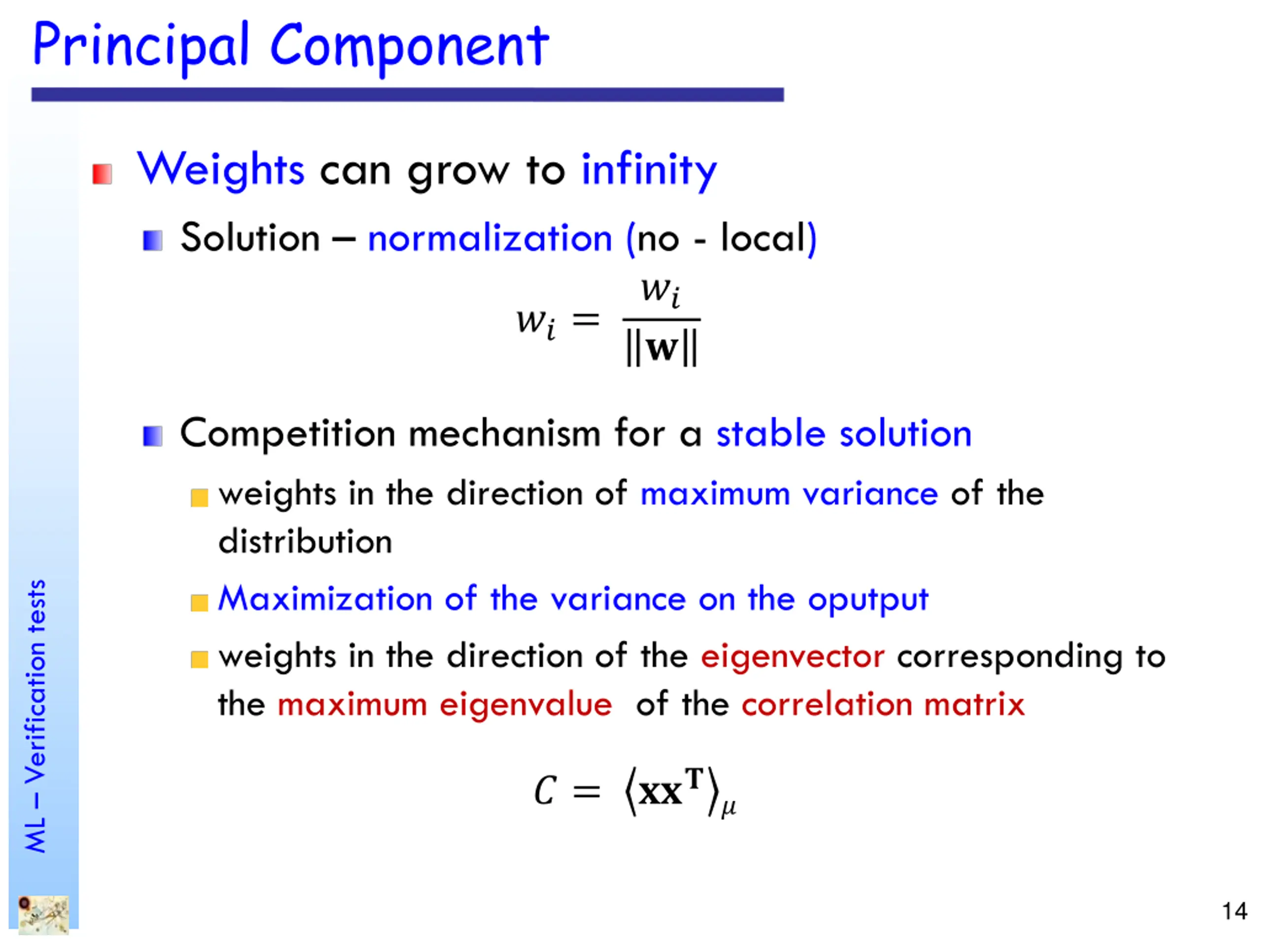Principal Component Weights can grow to infinity Solution normalization (no - local) ?? ? ??= Competition mechanism for a stable solution weights in the direction of maximum variance of the distribution Maximization of the variance on the oputput weights in the direction of the eigenvector corresponding to the maximum eigenvalue of the correlation matrix ML Verification tests ? = ??? ? 14