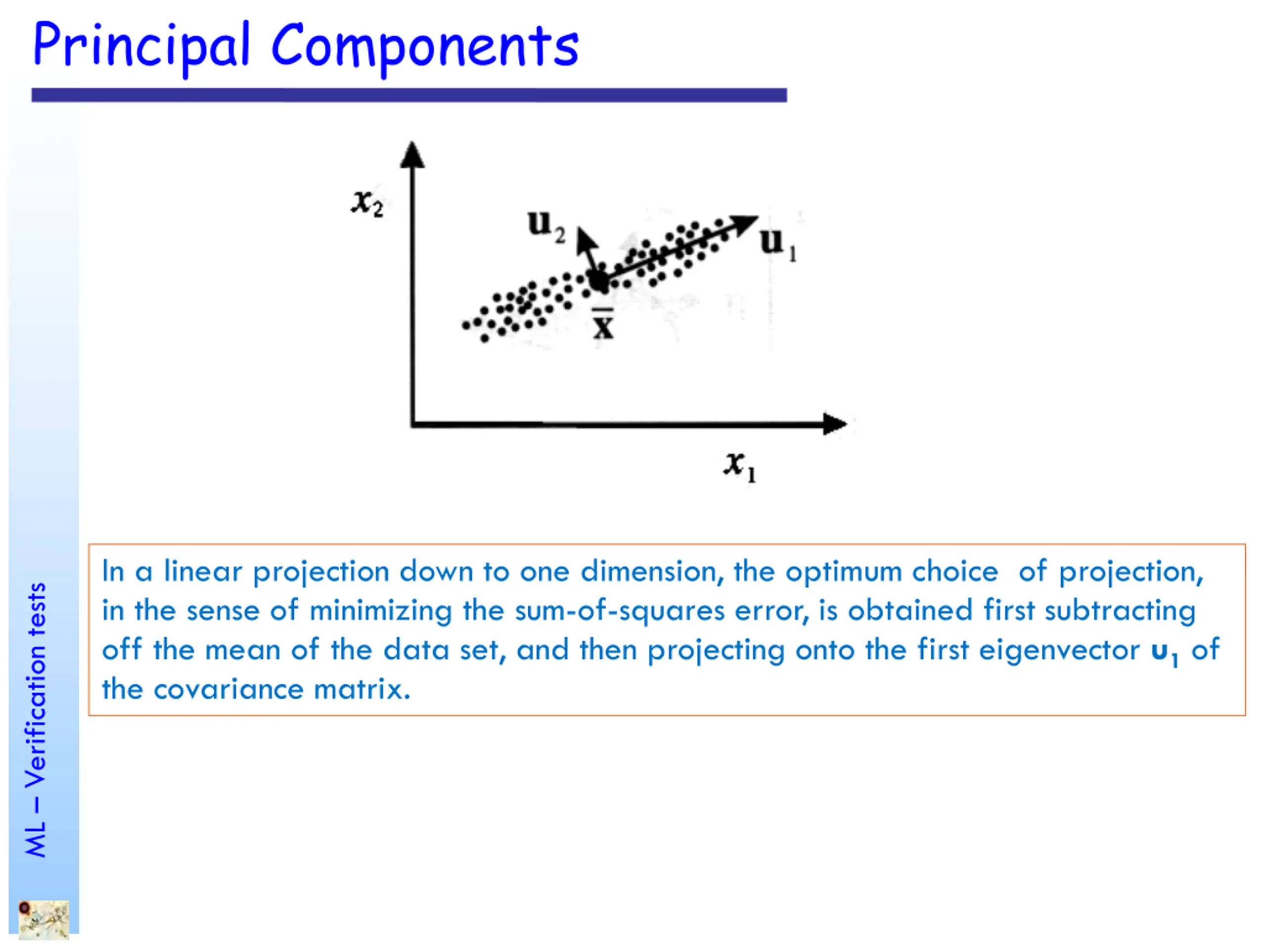 Principal Components In a linear projection down to one dimension, the optimum choice of projection, in the sense of minimizing the sum-of-squares error, is obtained first subtracting off the mean of the data set, and then projecting onto the first eigenvector u1of the covariance matrix. ML Verification tests
