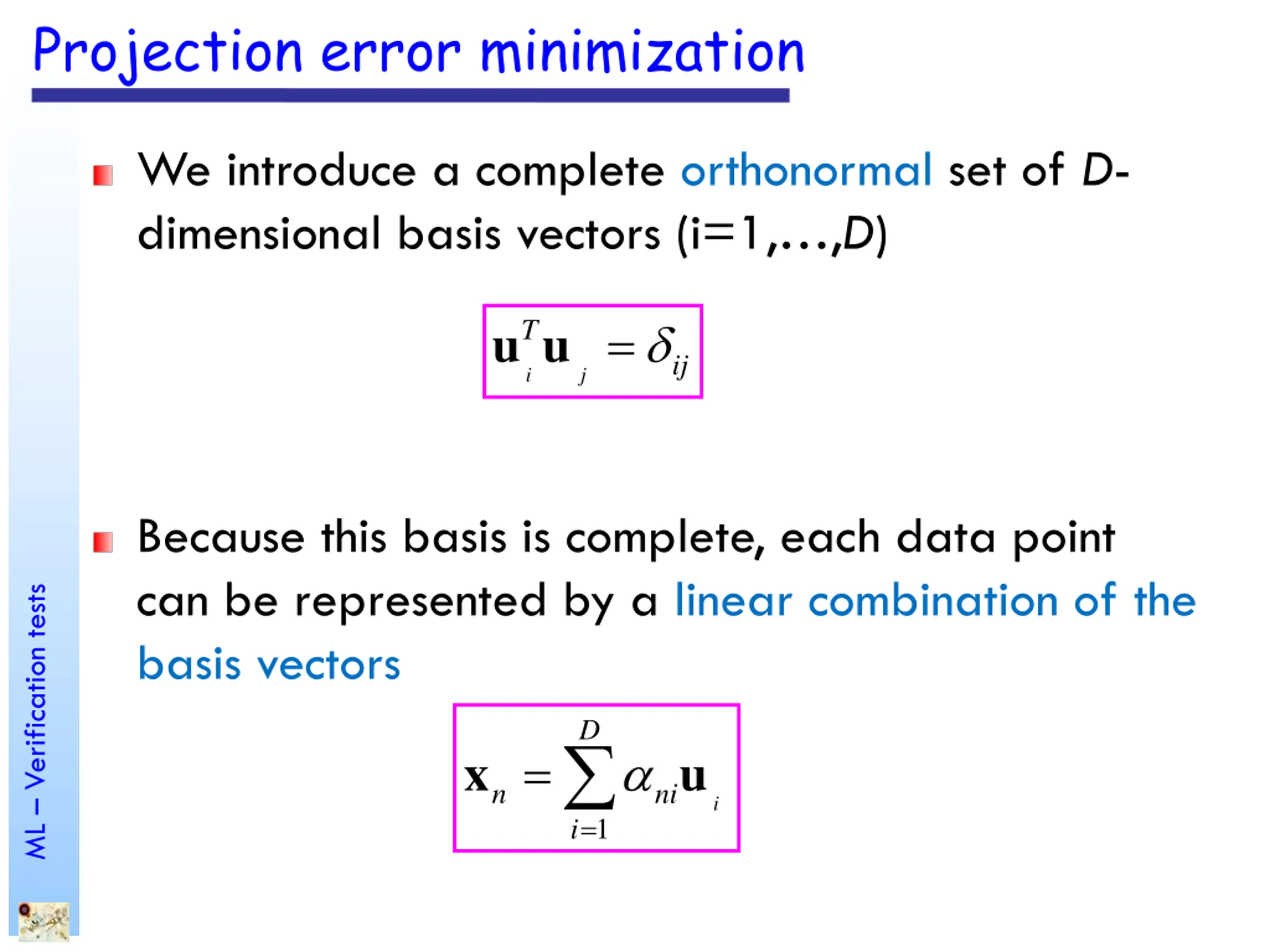 Projection error minimization We introduce a complete orthonormal set of D- dimensional basis vectors (i=1, ,D) = T u u ij i j Because this basis is complete, each data point can be represented by a linear combination of the basis vectors = i 1 ML Verification tests D = x u n ni i