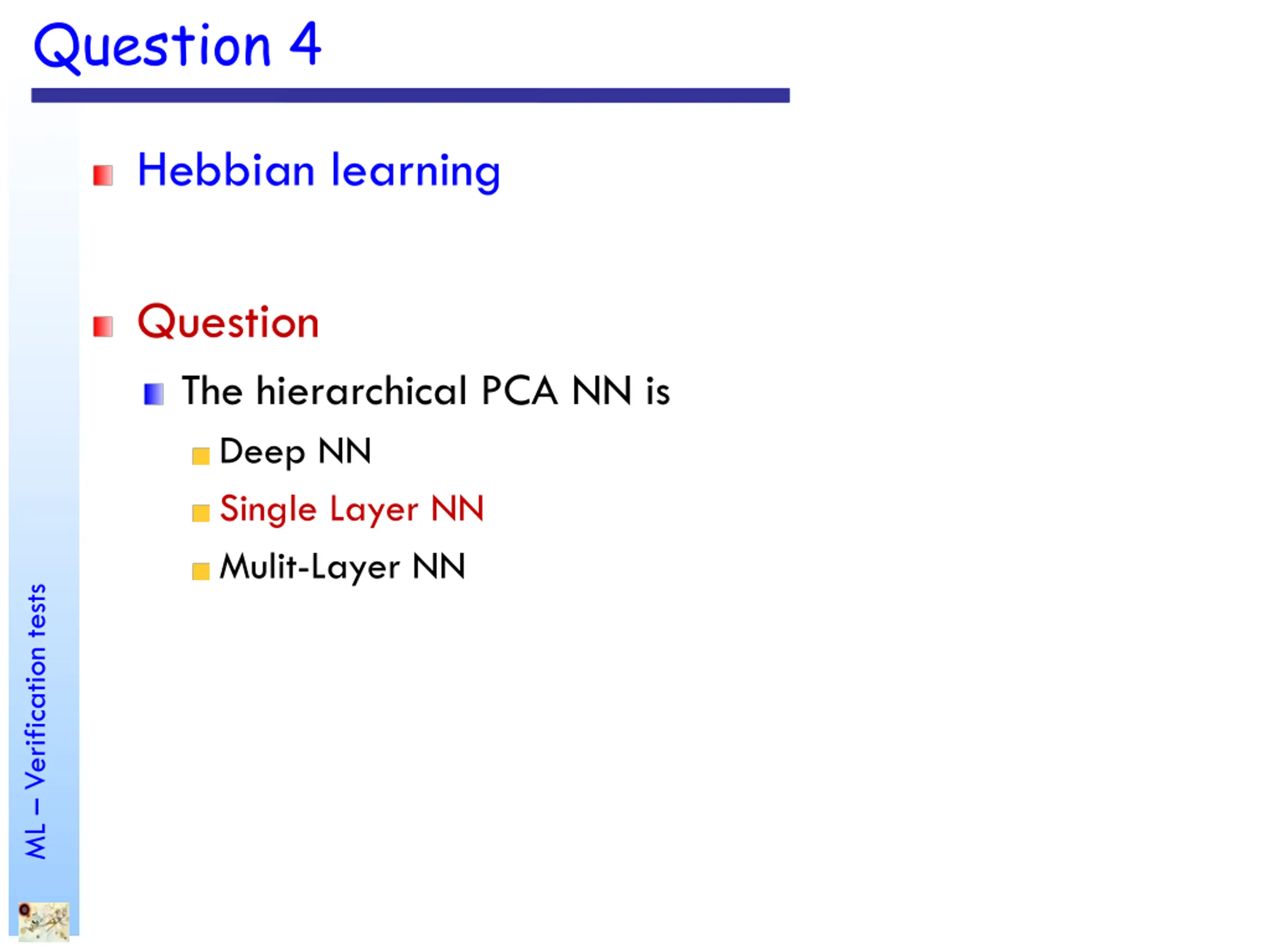 Question 4 Hebbian learning Question The hierarchical PCA NN is Deep NN Single Layer NN Mulit-Layer NN ML Verification tests .