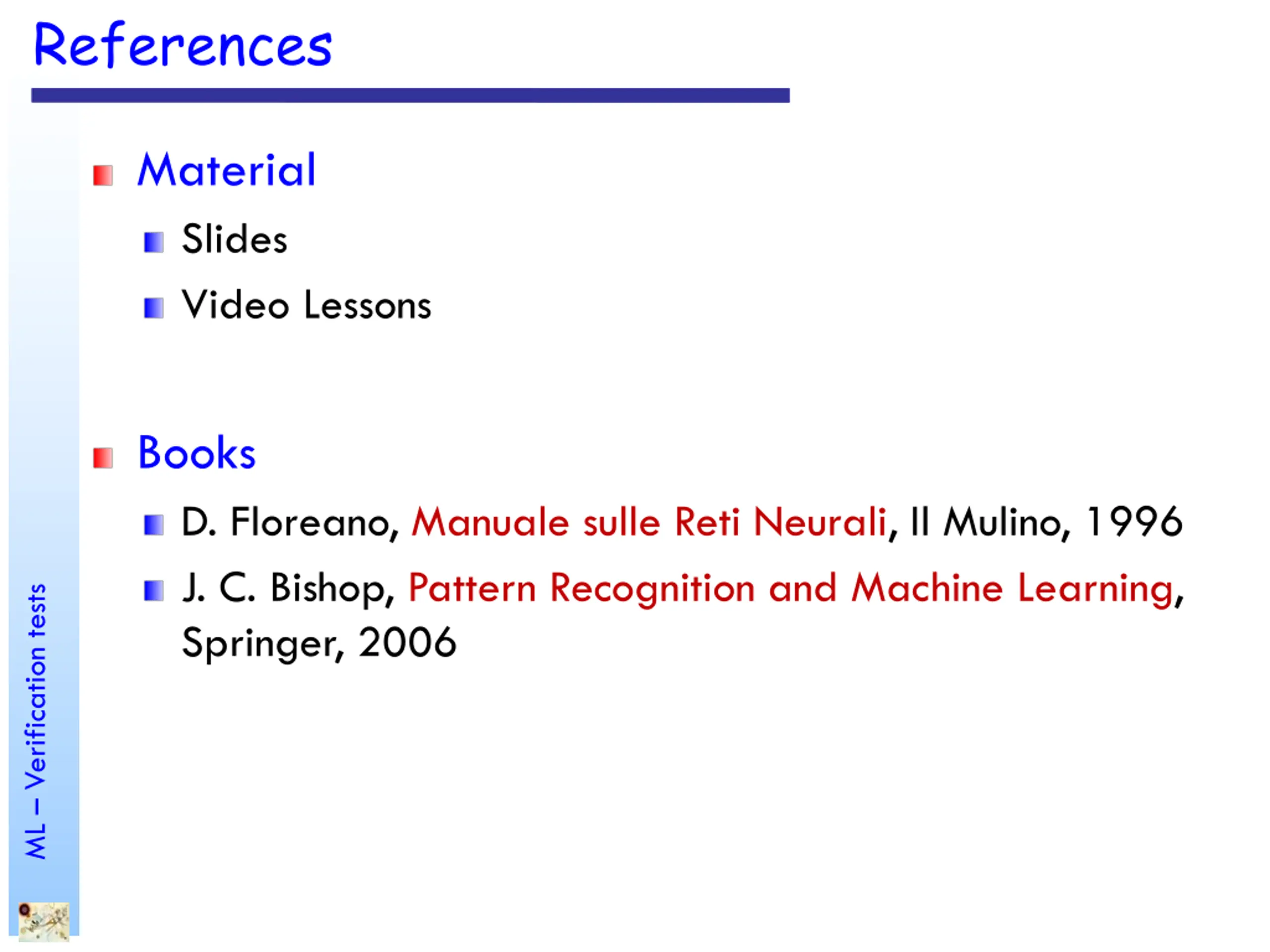References Material Slides Video Lessons Books D. Floreano, Manuale sulle Reti Neurali, Il Mulino, 1996 J. C. Bishop, Pattern Recognition and Machine Learning, Springer, 2006 ML Verification tests