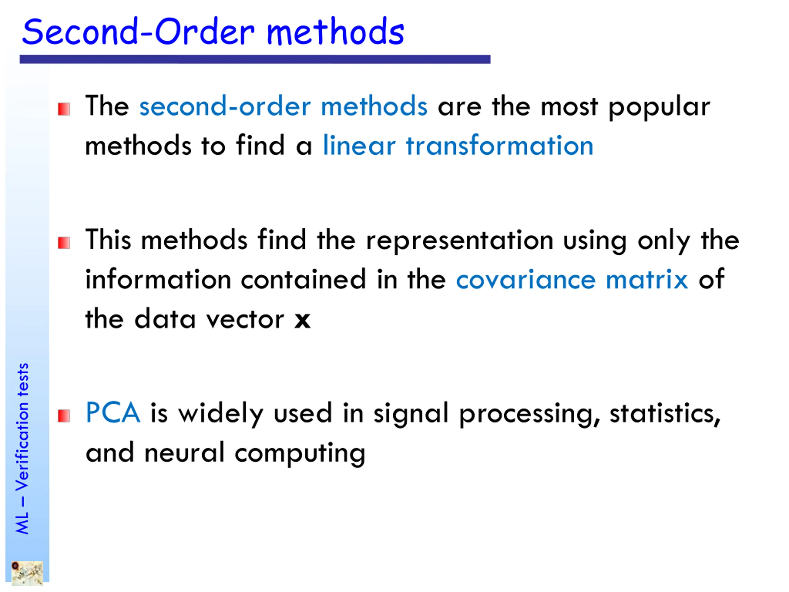 Second-Order methods The second-order methods are the most popular methods to find a linear transformation This methods find the representation using only the information contained in the covariance matrix of the data vector x ML Verification tests PCA is widely used in signal processing, statistics, and neural computing