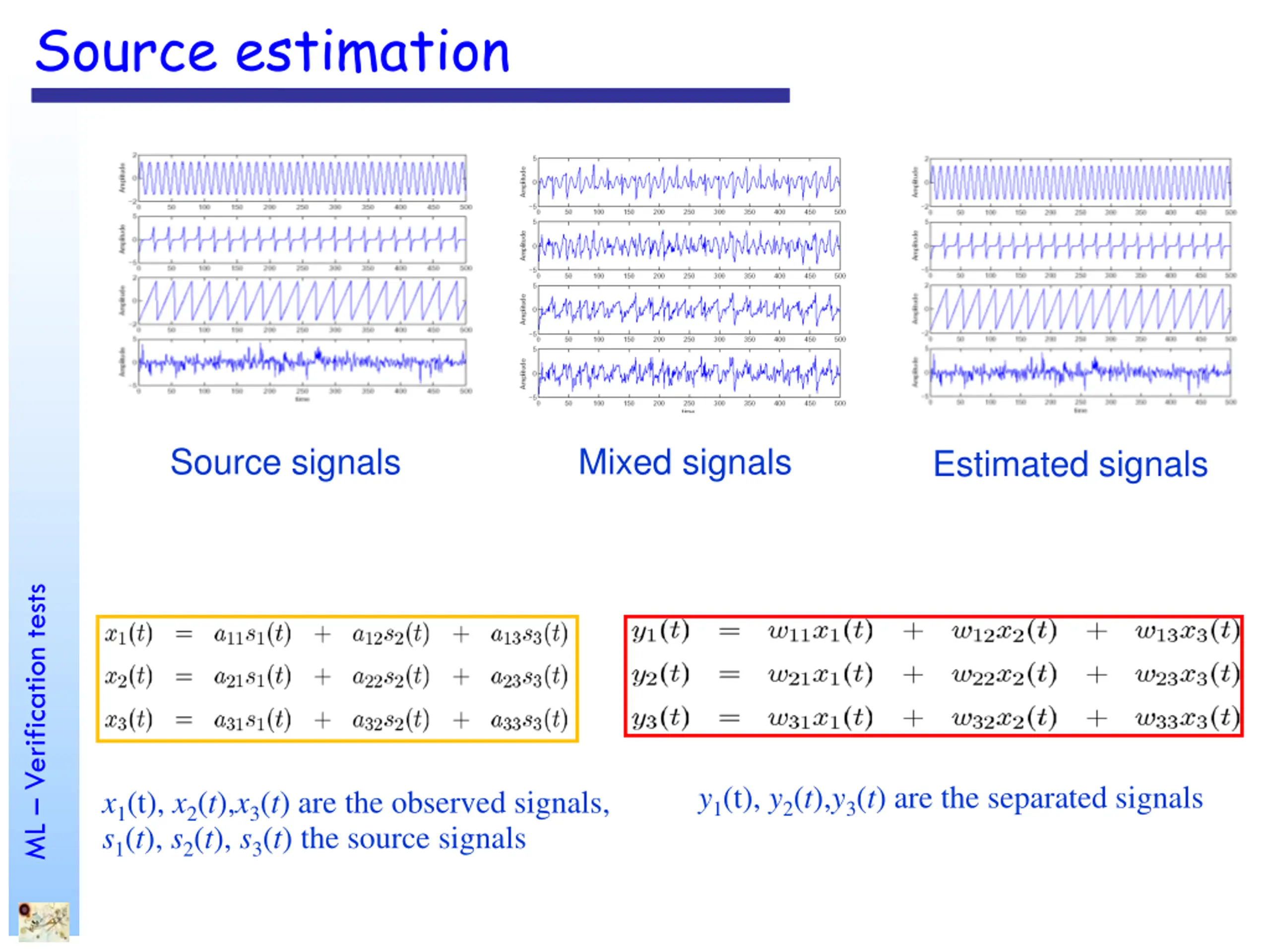 Source estimation Source signals Mixed signals Estimated signals ML Verification tests y1(t), y2(t),y3(t) are the separated signals x1(t), x2(t),x3(t) are the observed signals, s1(t), s2(t), s3(t) the source signals