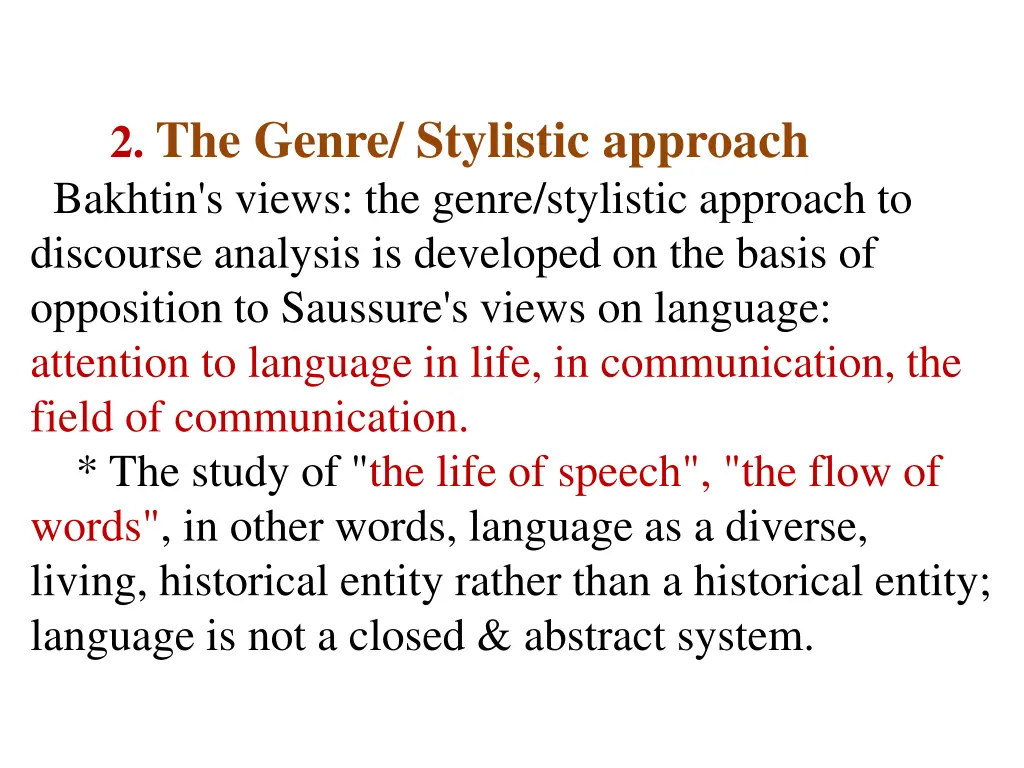 2. The Genre/ Stylistic approach Bakhtin's views: the genre/stylistic approach to discourse analysis is developed on the basis of opposition to Saussure's views on language: attention to language in life, in communication, the field of communication. * The study of "the life of speech", "the flow of words", in other words, language as a diverse, living, historical entity rather than a historical entity; language is not a closed & abstract system.