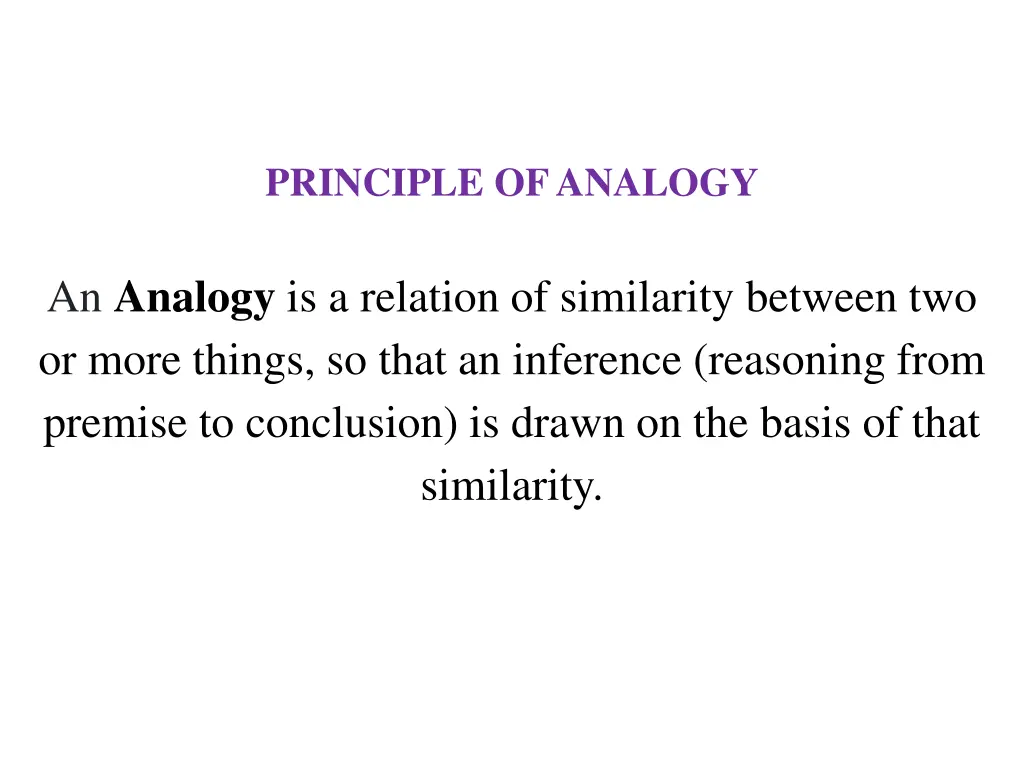PRINCIPLE OF ANALOGY An Analogy is a relation of similarity between two or more things, so that an inference (reasoning from premise to conclusion) is drawn on the basis of that similarity.