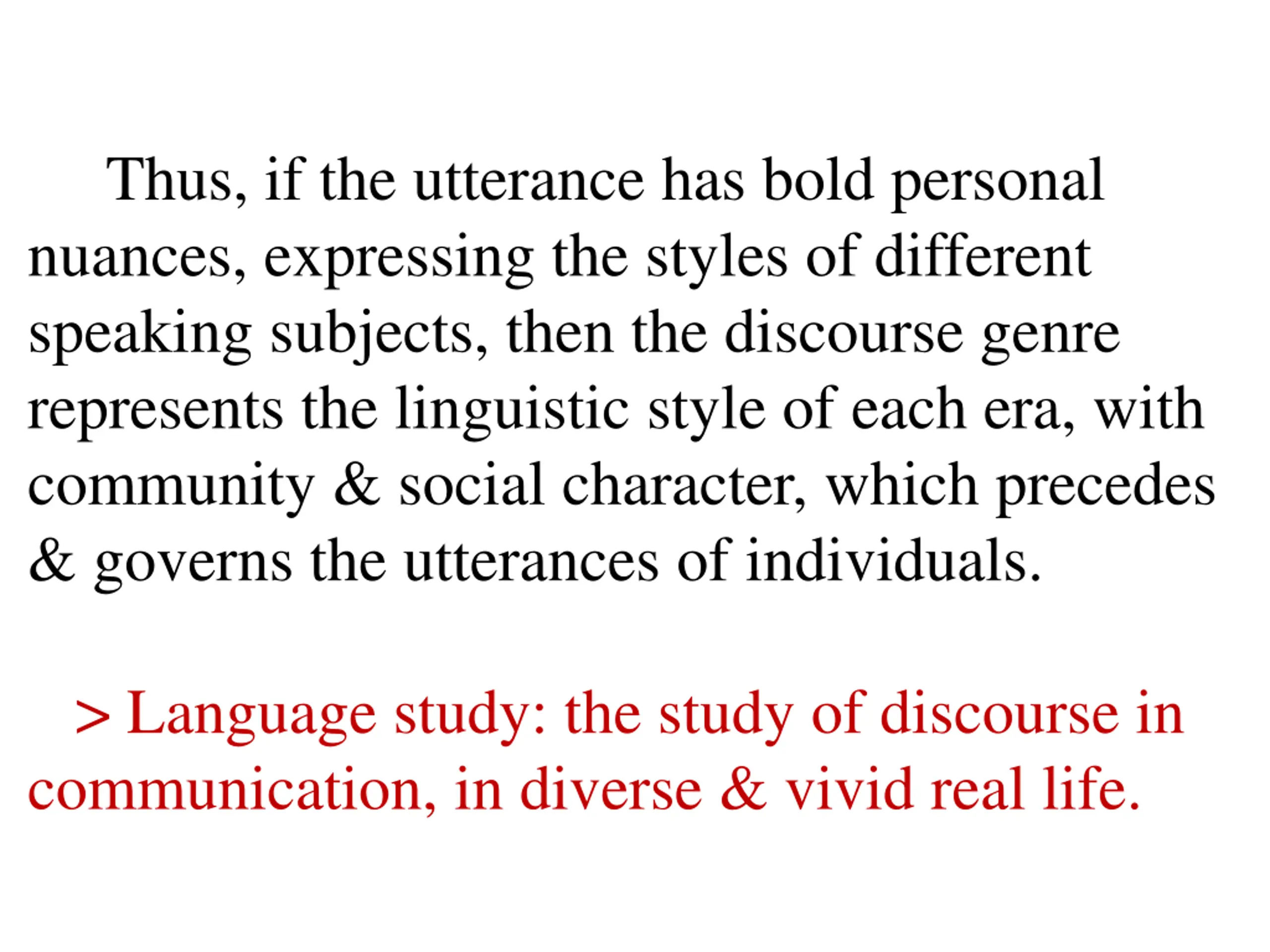 Thus, if the utterance has bold personal nuances, expressing the styles of different speaking subjects, then the discourse genre represents the linguistic style of each era, with community & social character, which precedes & governs the utterances of individuals. > Language study: the study of discourse in communication, in diverse & vivid real life.