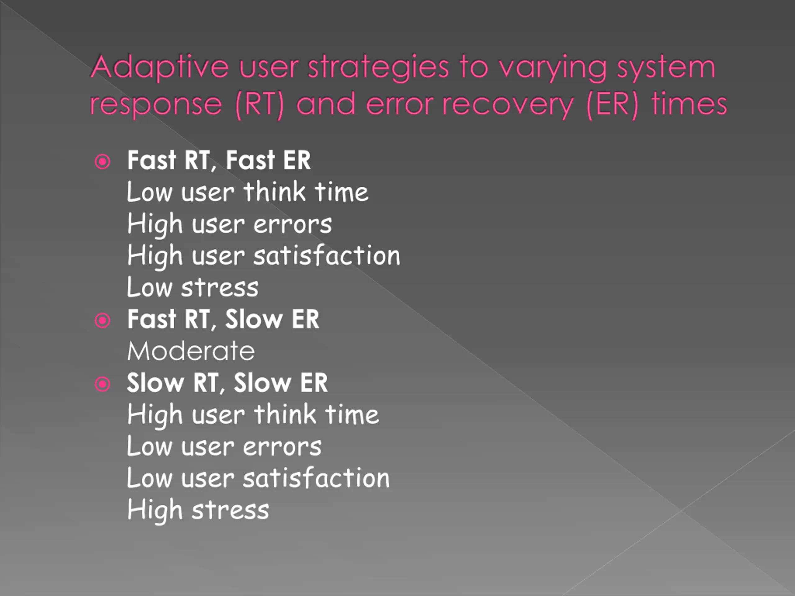 Adaptive user strategies to varying system response (RT) and error recovery (ER) times Fast RT, Fast ER Low user think time High user errors High user satisfaction Low stress Fast RT, Slow ER Moderate Slow RT, Slow ER High user think time Low user errors Low user satisfaction High stress