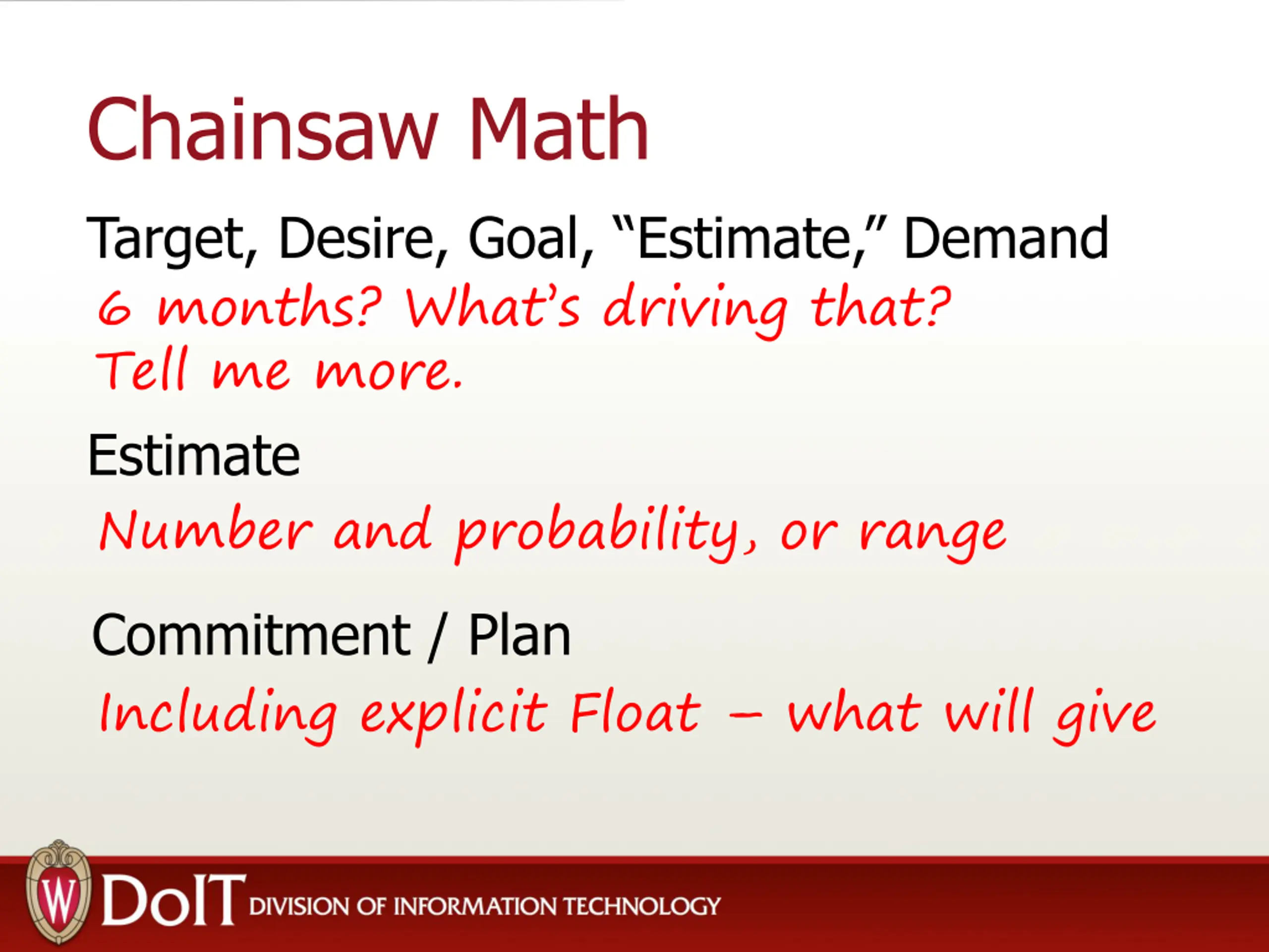 Chainsaw Math Target, Desire, Goal, Estimate, Demand 6 months? What s driving that? Tell me more. Estimate Number and probability, or range Commitment / Plan Including explicit Float what will give