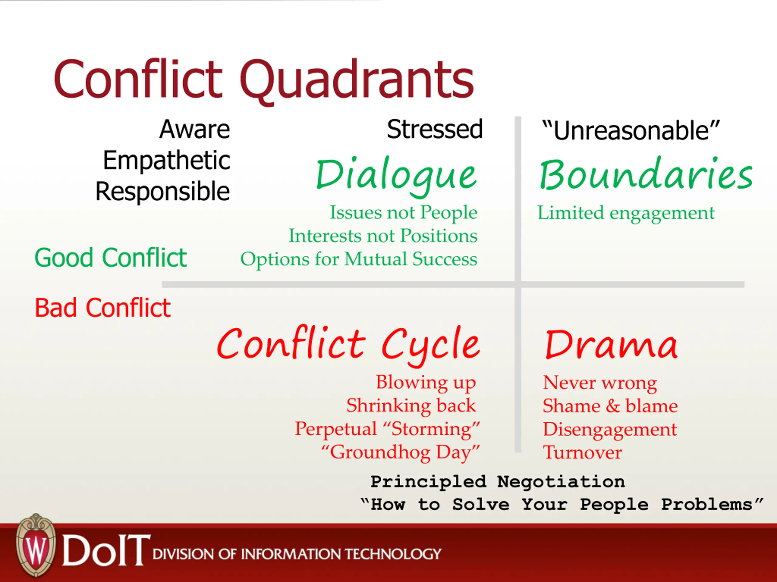 Conflict Quadrants Aware Empathetic Responsible Stressed Unreasonable Boundaries Limited engagement Dialogue Issues not People Interests not Positions Options for Mutual Success Good Conflict Bad Conflict Conflict Cycle Drama Never wrong Shame & blame Disengagement Turnover Blowing up Shrinking back Perpetual Storming Groundhog Day Principled Negotiation How to Solve Your People Problems