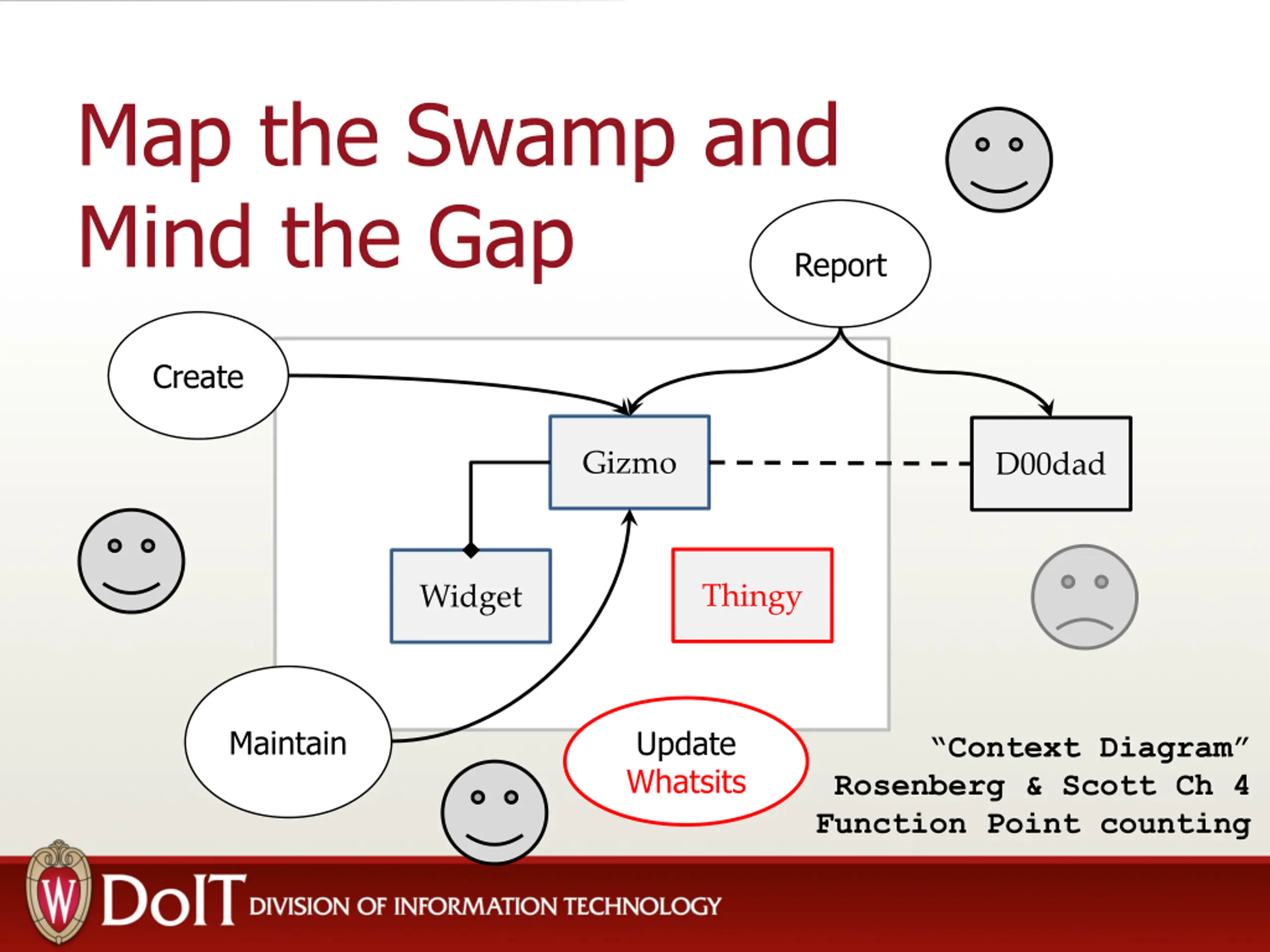 Map the Swamp and Mind the Gap Report Create Gizmo D00dad Thingy Widget Maintain Update Whatsits Context Diagram Rosenberg & Scott Ch 4 Function Point counting