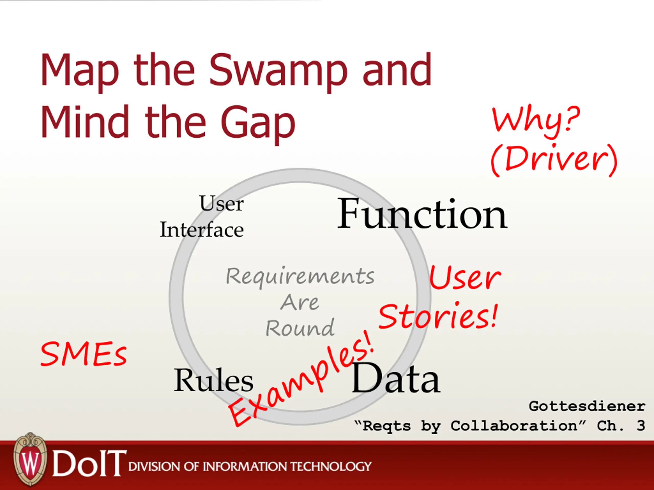 Map the Swamp and Mind the Gap Why? (Driver) User Function Interface User Requirements Are Round Stories! SMEs Data Rules Gottesdiener Reqts by Collaboration Ch. 3