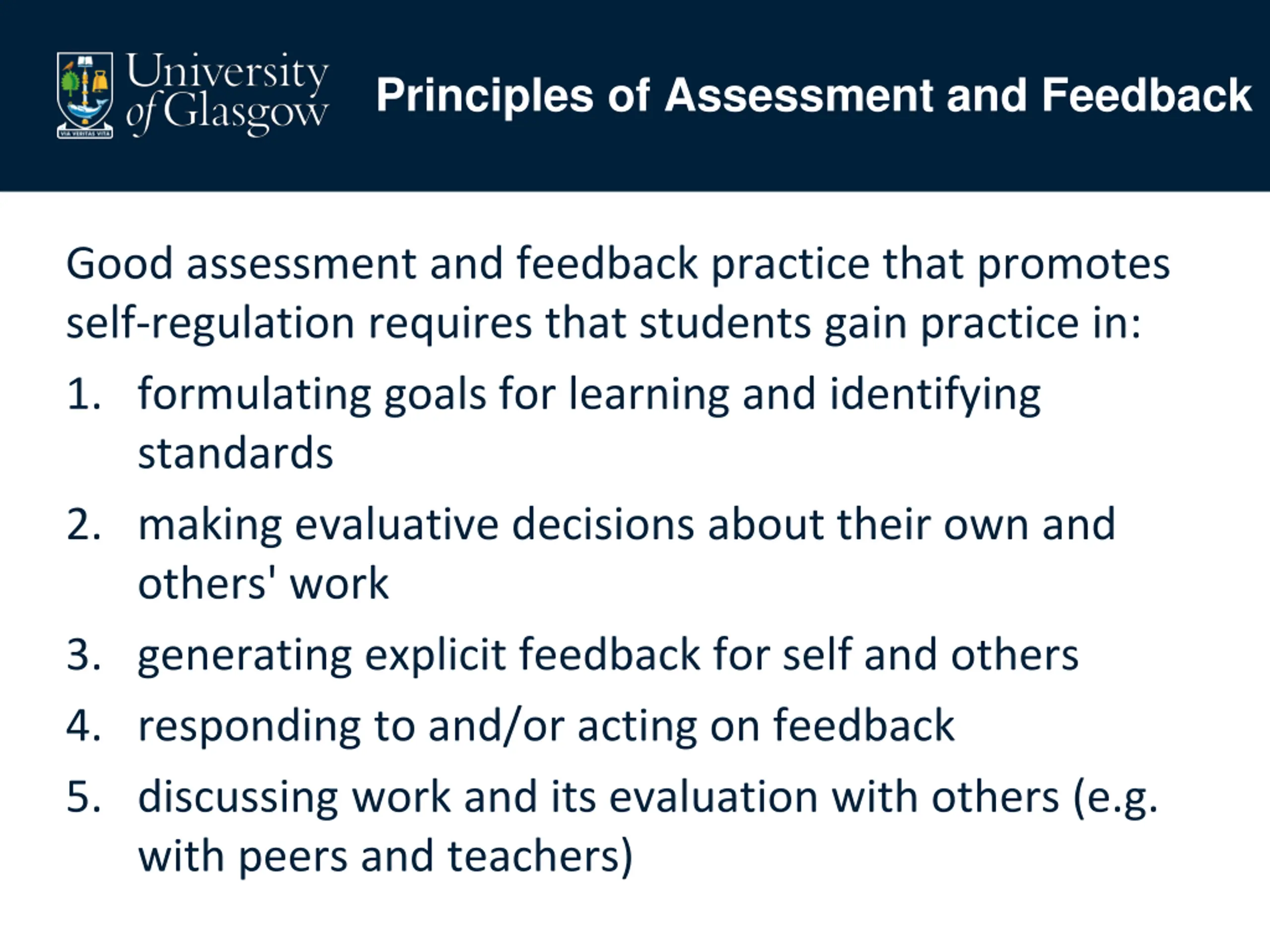 Principles of Assessment and Feedback Good assessment and feedback practice that promotes self-regulation requires that students gain practice in: 1. formulating goals for learning and identifying standards 2. making evaluative decisions about their own and others' work 3. generating explicit feedback for self and others 4. responding to and/or acting on feedback 5. discussing work and its evaluation with others (e.g. with peers and teachers)