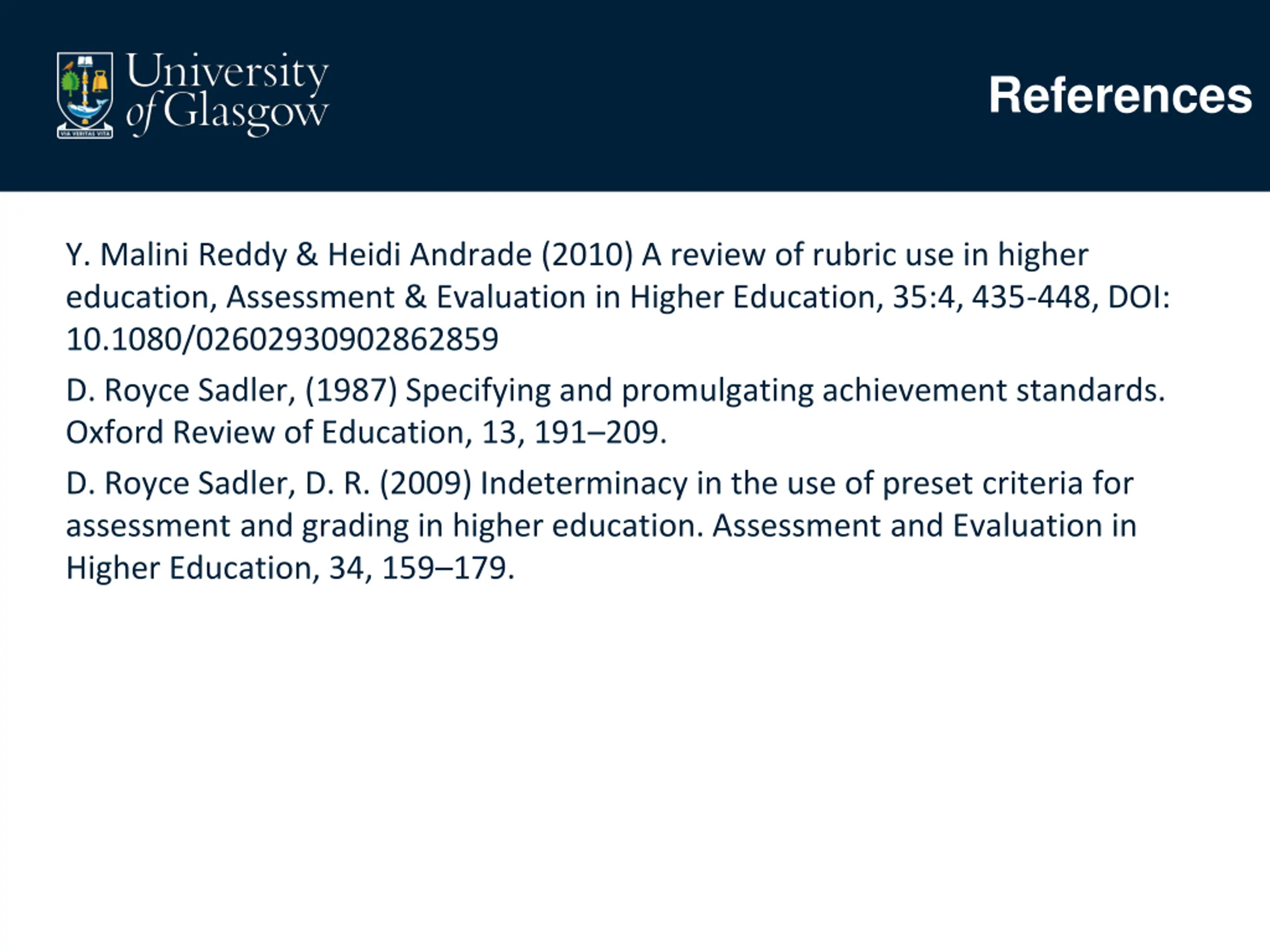 References Y. Malini Reddy & Heidi Andrade (2010) A review of rubric use in higher education, Assessment & Evaluation in Higher Education, 35:4, 435-448, DOI: 10.1080/02602930902862859 D. Royce Sadler, (1987) Specifying and promulgating achievement standards. Oxford Review of Education, 13, 191 209. D. Royce Sadler, D. R. (2009) Indeterminacy in the use of preset criteria for assessment and grading in higher education. Assessment and Evaluation in Higher Education, 34, 159 179.