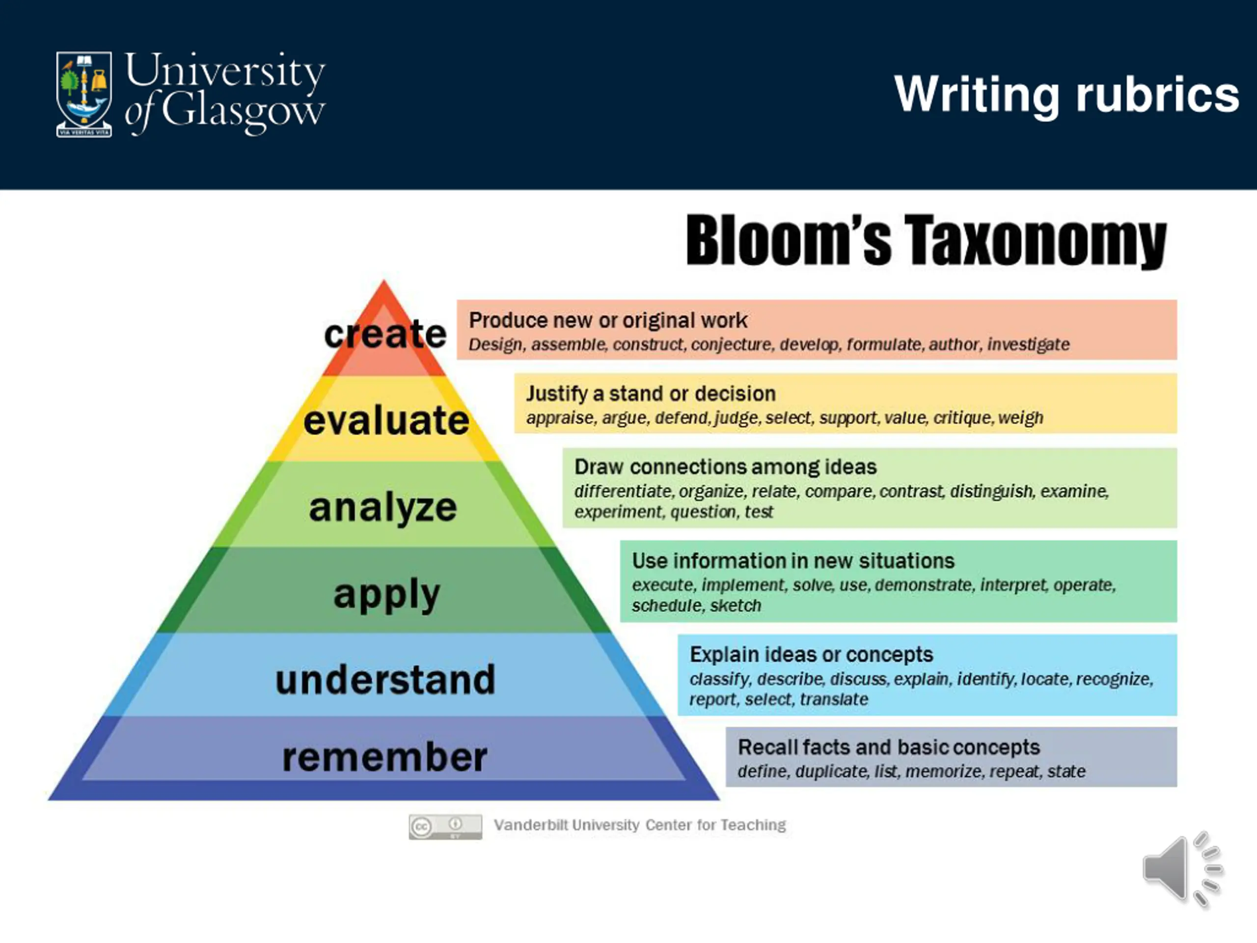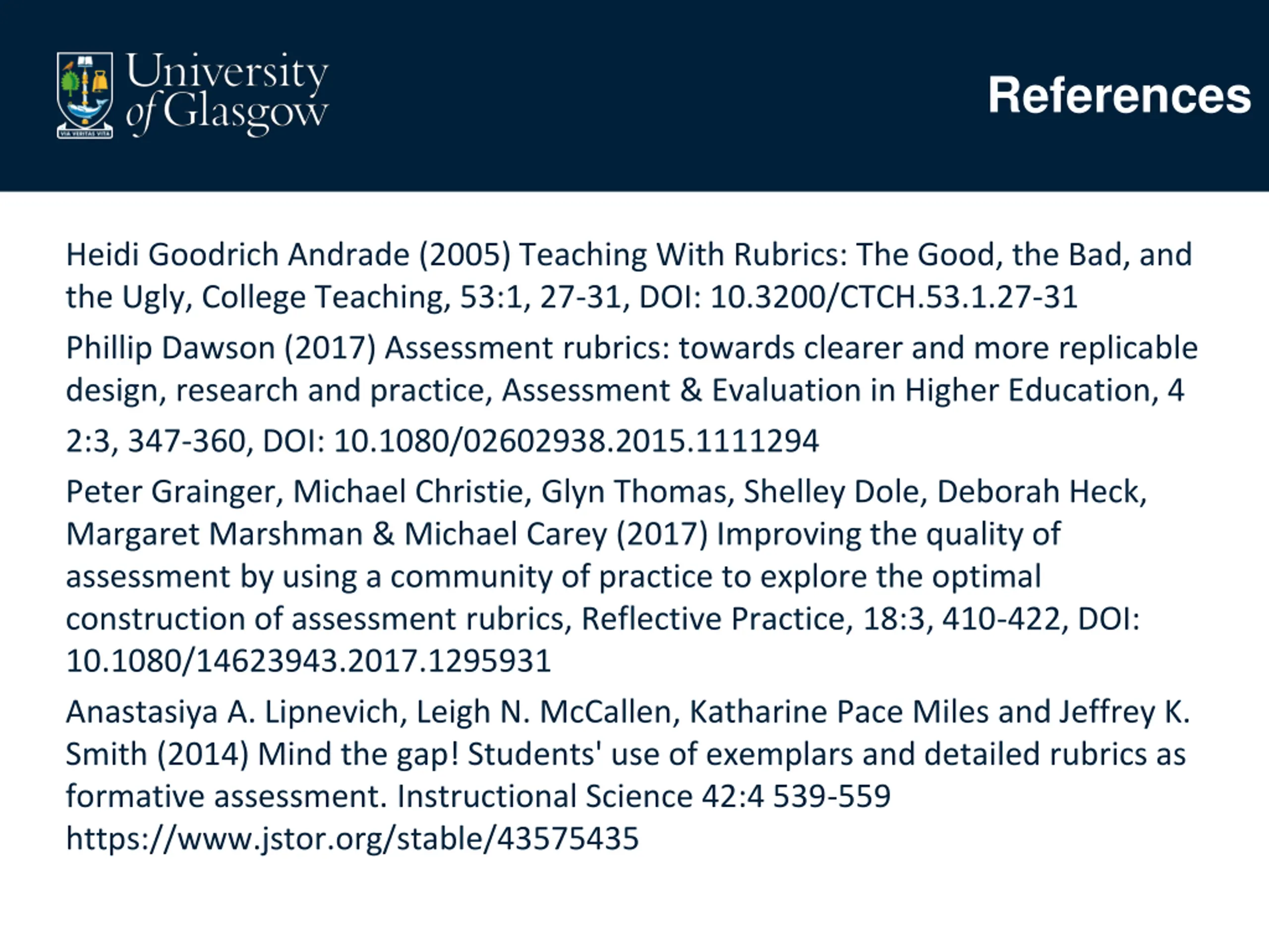 References Heidi Goodrich Andrade (2005) Teaching With Rubrics: The Good, the Bad, and the Ugly, College Teaching, 53:1, 27-31, DOI: 10.3200/CTCH.53.1.27-31 Phillip Dawson (2017) Assessment rubrics: towards clearer and more replicable design, research and practice, Assessment & Evaluation in Higher Education, 4 2:3, 347-360, DOI: 10.1080/02602938.2015.1111294 Peter Grainger, Michael Christie, Glyn Thomas, Shelley Dole, Deborah Heck, Margaret Marshman & Michael Carey (2017) Improving the quality of assessment by using a community of practice to explore the optimal construction of assessment rubrics, Reflective Practice, 18:3, 410-422, DOI: 10.1080/14623943.2017.1295931 Anastasiya A. Lipnevich, Leigh N. McCallen, Katharine Pace Miles and Jeffrey K. Smith (2014) Mind the gap! Students' use of exemplars and detailed rubrics as formative assessment. Instructional Science 42:4 539-559 https://www.jstor.org/stable/43575435