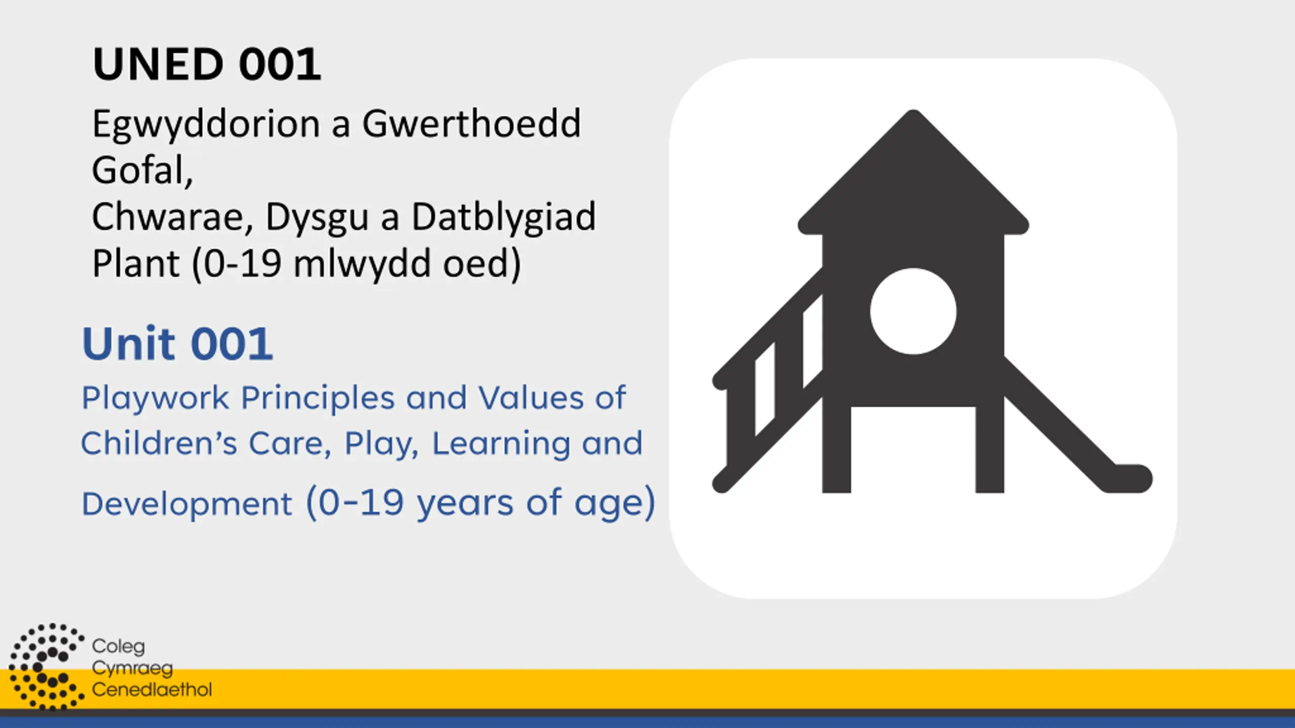 UNED 001 Egwyddorion a Gwerthoedd Gofal, Chwarae, Dysgu a Datblygiad Plant (0-19 mlwydd oed) Unit 001 Playwork Principles and Values of Children s Care, Play, Learning and Development (0-19 years of age)