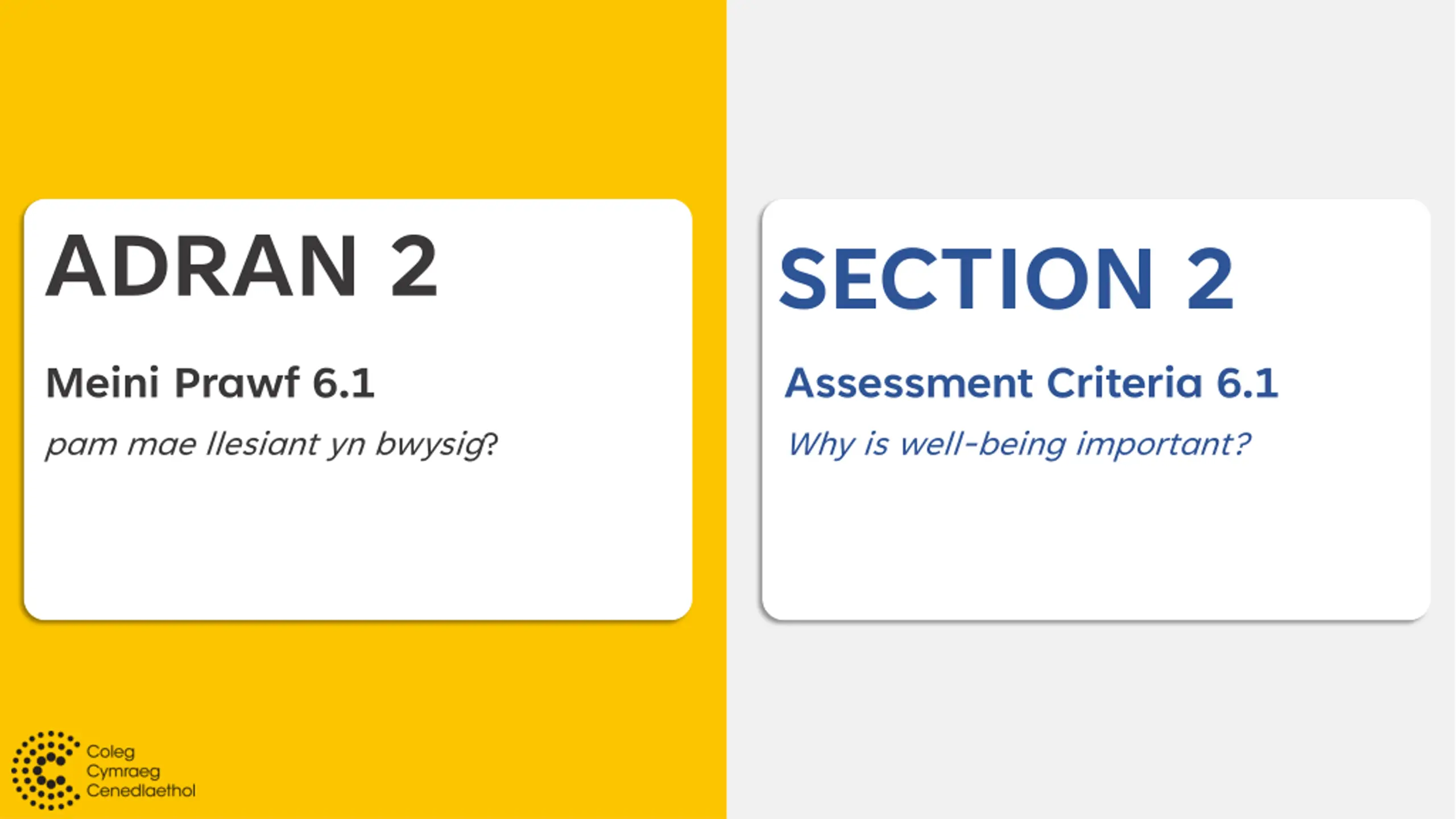 ADRAN 2 SECTION 2 Meini Prawf 6.1 pam mae llesiant yn bwysig? Assessment Criteria 6.1 Why is well-being important? v v