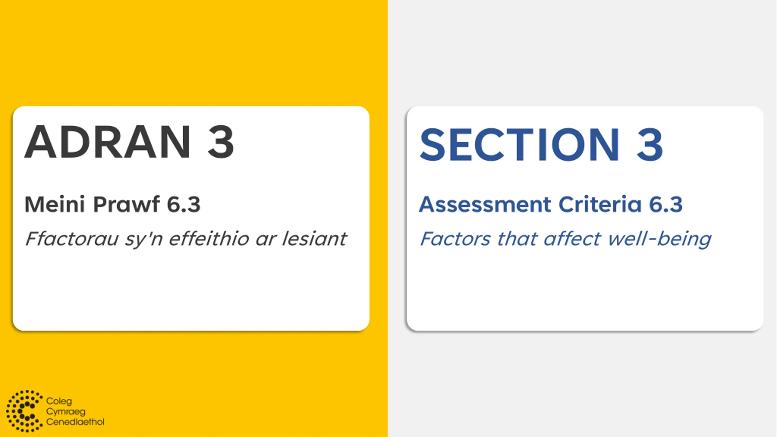 ADRAN 3 SECTION 3 Meini Prawf 6.3 Ffactorau sy'n effeithio ar lesiant Assessment Criteria 6.3 Factors that affect well-being v v