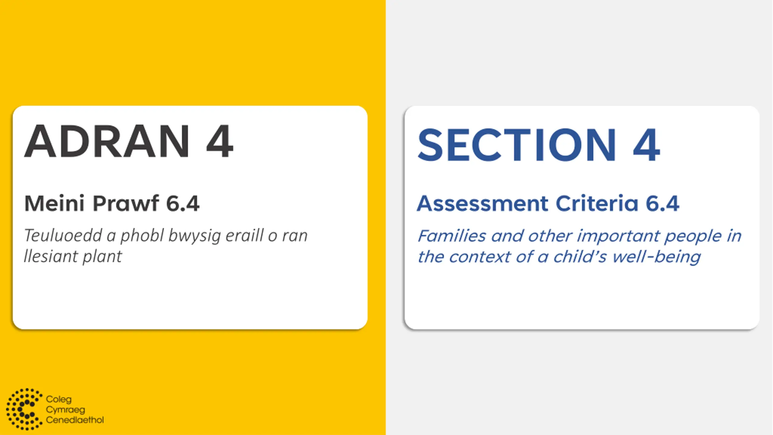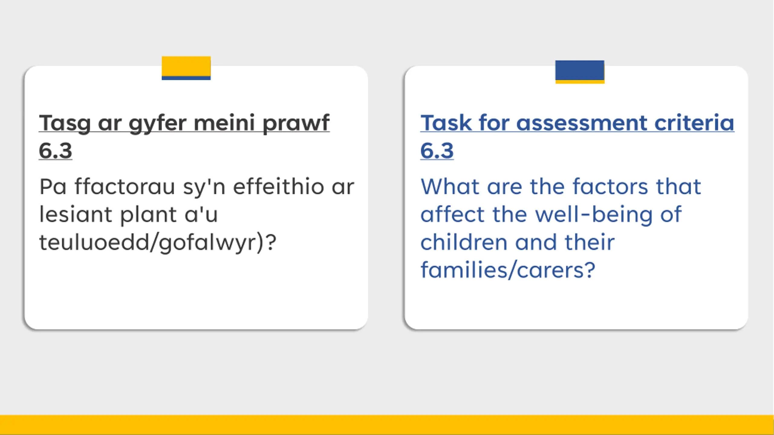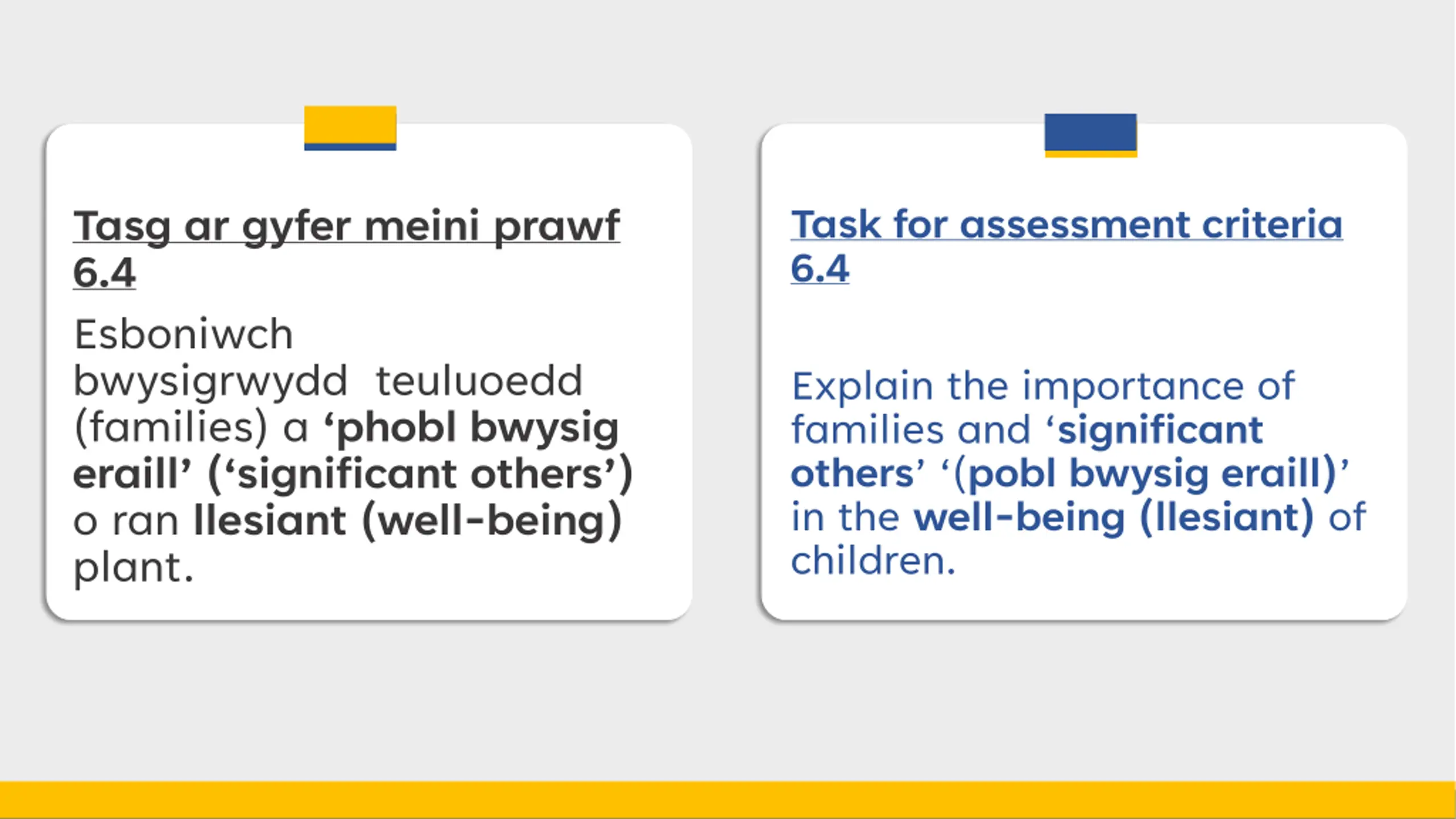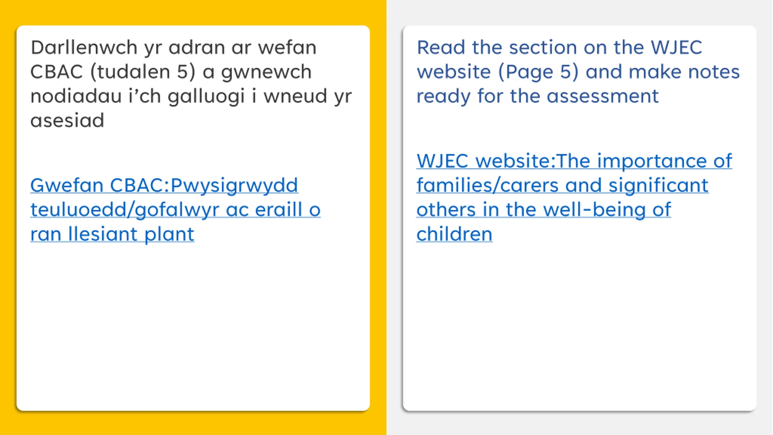Darllenwch yr adran ar wefan CBAC (tudalen 5) a gwnewch nodiadau i ch galluogi i wneud yr asesiad Read the section on the WJEC website (Page 5) and make notes ready for the assessment WJEC website:The importance of families/carers and significant others in the well-being of children Gwefan CBAC:Pwysigrwydd teuluoedd/gofalwyr ac eraill o ran llesiant plant