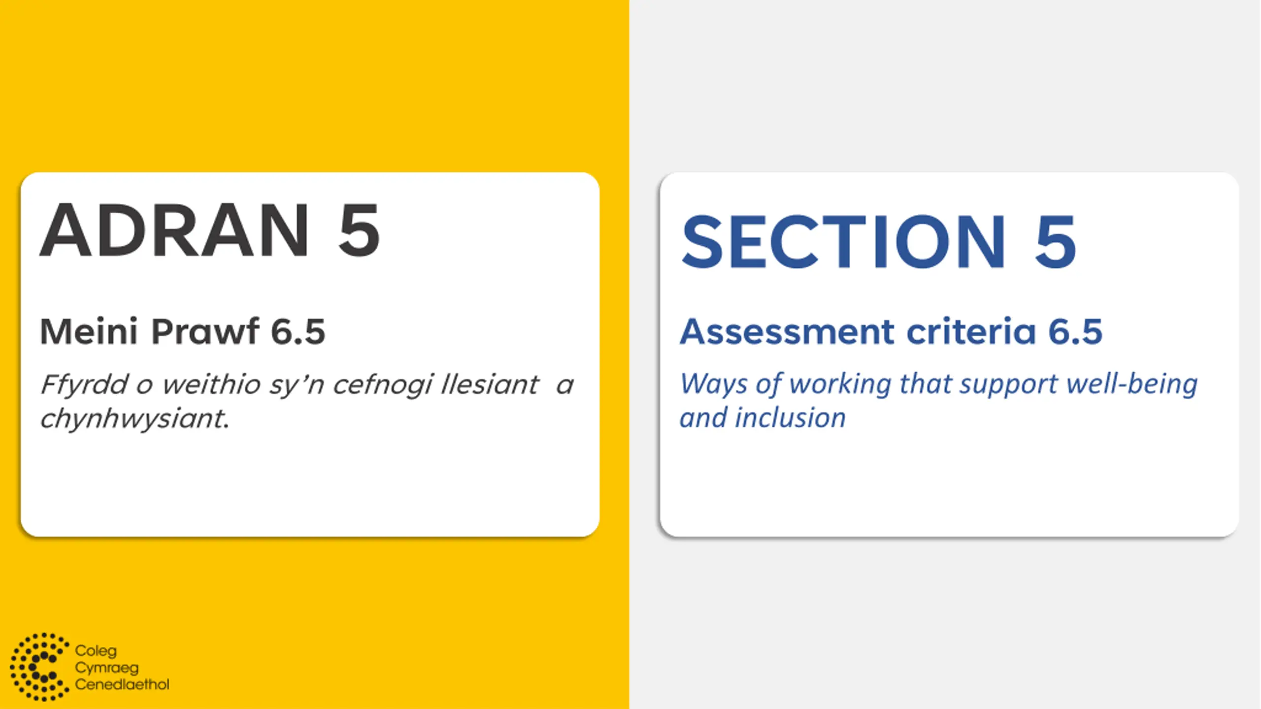 ADRAN 5 SECTION 5 Meini Prawf 6.5 Ffyrdd o weithio sy n cefnogi llesiant a chynhwysiant. Assessment criteria 6.5 Ways of working that support well-being and inclusion v v