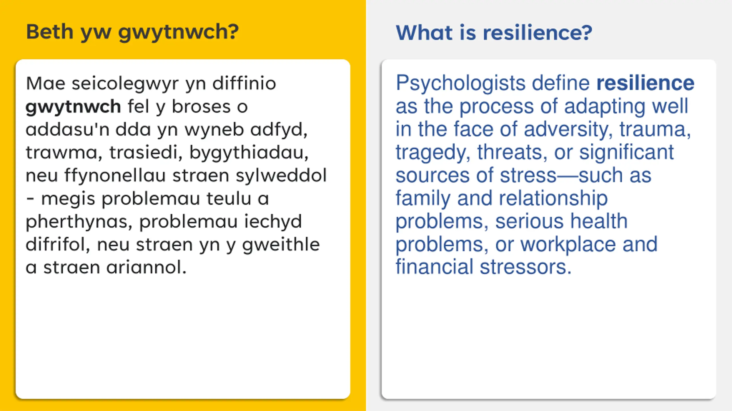 Beth yw gwytnwch? What is resilience? Mae seicolegwyr yn diffinio gwytnwch fel y broses o addasu'n dda yn wyneb adfyd, trawma, trasiedi, bygythiadau, neu ffynonellau straen sylweddol - megis problemau teulu a pherthynas, problemau iechyd difrifol, neu straen yn y gweithle a straen ariannol. Psychologists define resilience as the process of adapting well in the face of adversity, trauma, tragedy, threats, or significant sources of stress such as family and relationship problems, serious health problems, or workplace and financial stressors.