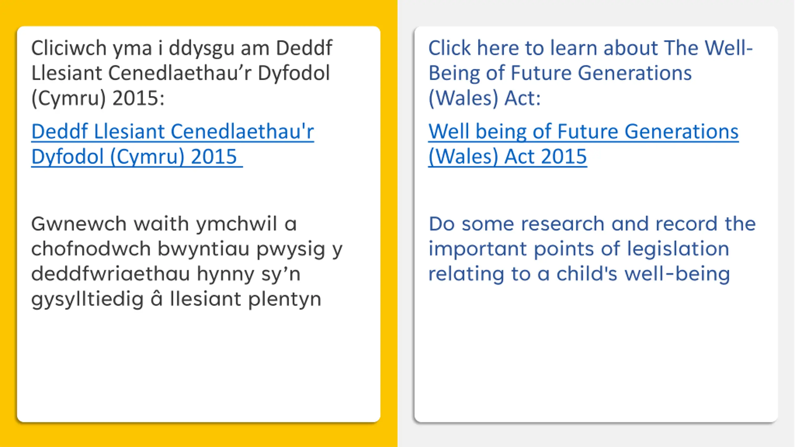 Cliciwch yma i ddysgu am Deddf Llesiant Cenedlaethau r Dyfodol (Cymru) 2015: Deddf Llesiant Cenedlaethau'r Dyfodol (Cymru) 2015 Click here to learn about The Well- Being of Future Generations (Wales) Act: Well being of Future Generations (Wales) Act 2015 Gwnewch waith ymchwil a chofnodwch bwyntiau pwysig y deddfwriaethau hynny sy n gysylltiedig llesiant plentyn Do some research and record the important points of legislation relating to a child's well-being