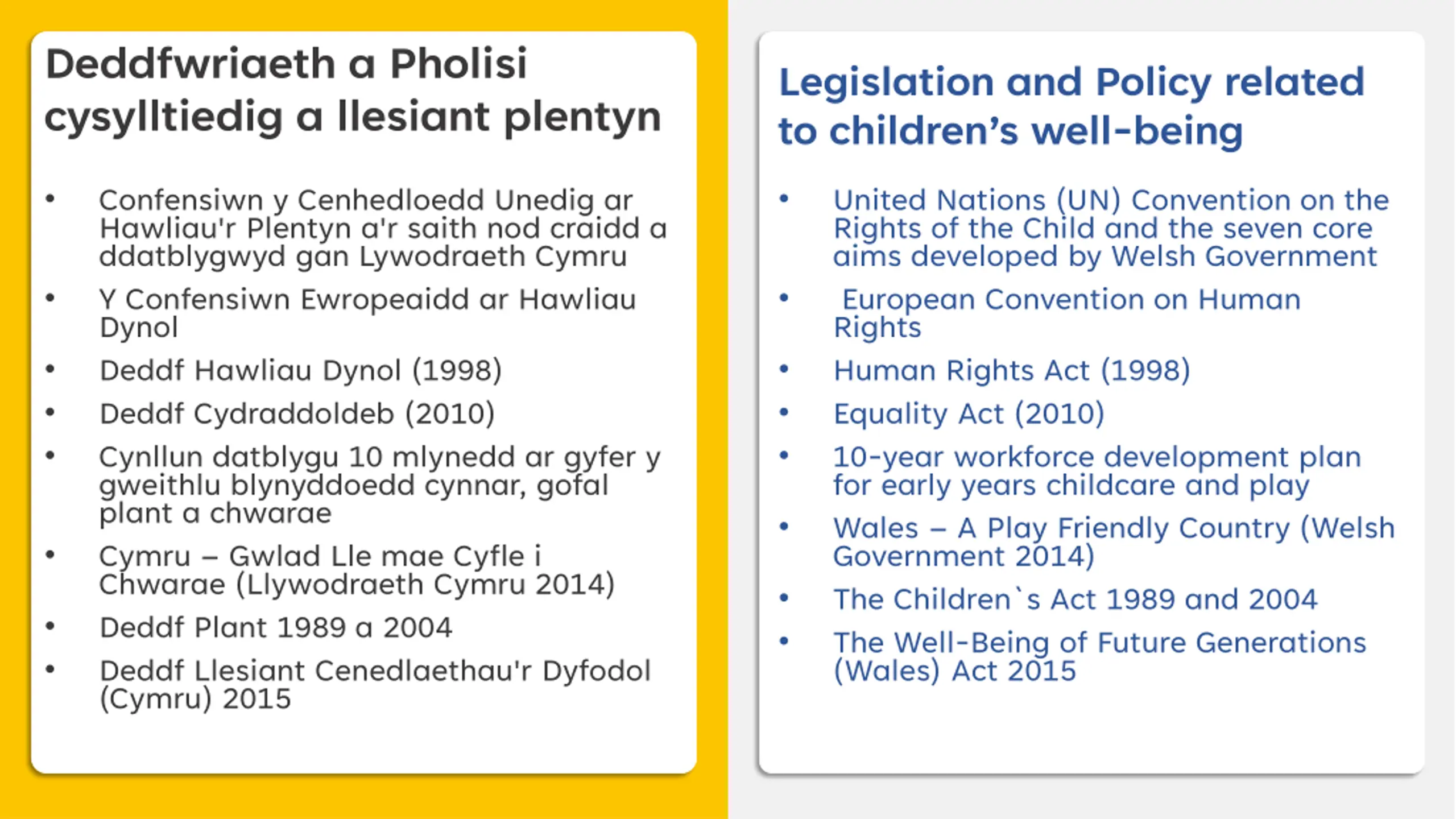 Deddfwriaeth a Pholisi cysylltiedig a llesiant plentyn Legislation and Policy related to children s well-being Confensiwn y Cenhedloedd Unedig ar Hawliau'r Plentyn a'r saith nod craidd a ddatblygwyd gan Lywodraeth Cymru Y Confensiwn Ewropeaidd ar Hawliau Dynol Deddf Hawliau Dynol (1998) Deddf Cydraddoldeb (2010) Cynllun datblygu 10 mlynedd ar gyfer y gweithlu blynyddoedd cynnar, gofal plant a chwarae Cymru Gwlad Lle mae Cyfle i Chwarae (Llywodraeth Cymru 2014) Deddf Plant 1989 a 2004 Deddf Llesiant Cenedlaethau'r Dyfodol (Cymru) 2015 United Nations (UN) Convention on the Rights of the Child and the seven core aims developed by Welsh Government European Convention on Human Rights Human Rights Act (1998) Equality Act (2010) 10-year workforce development plan for early years childcare and play Wales A Play Friendly Country (Welsh Government 2014) The Children`s Act 1989 and 2004 The Well-Being of Future Generations (Wales) Act 2015