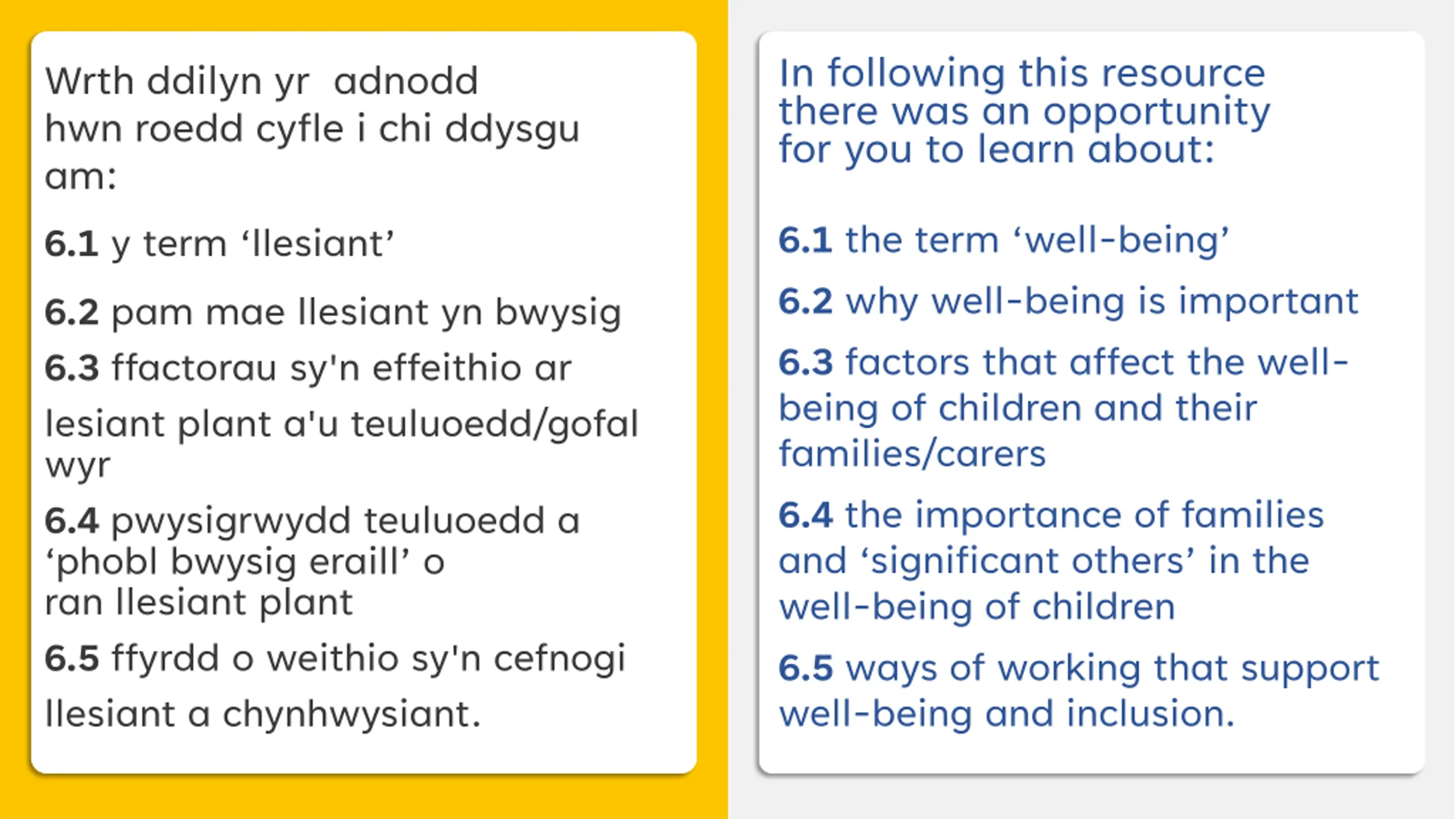 In following this resource there was an opportunity for you to learn about: Wrth ddilyn yr adnodd hwn roedd cyfle i chi ddysgu am: 6.1 y term llesiant 6.2 pam mae llesiant yn bwysig 6.3 ffactorau sy'n effeithio ar lesiant plant a'u teuluoedd/gofal wyr 6.4 pwysigrwydd teuluoedd a phobl bwysig eraill o ran llesiant plant 6.5 ffyrdd o weithio sy'n cefnogi llesiant a chynhwysiant. 6.1 the term well-being 6.2 why well-being is important 6.3 factors that affect the well- being of children and their families/carers 6.4 the importance of families and significant others in the well-being of children 6.5 ways of working that support well-being and inclusion.